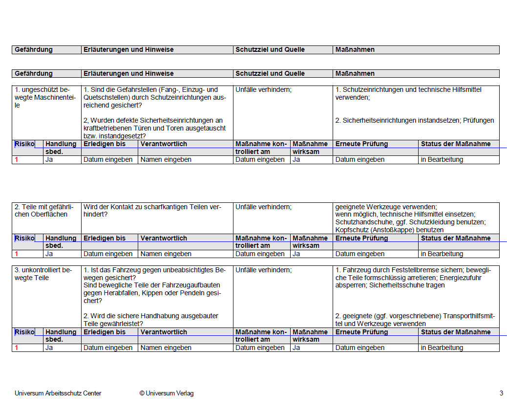 Gefaehrdungsbeurteilung kfz werkstatt muster. Grundsätzliches erfüllt ent fällt ja nein es werden alle notwendigen maßnahmen für die sichere bereitstellung und benutzung von arbeitsmitteln getroffen diese maßnahmen werden im bogen checkliste für arbeitsmittel teil 2 dokumentiert. Als hilfestellung für die ermittlung von gefährdungen für die beurteilung der arbeitsbedingungen und dokumentation nach arbeitsschutzgesetz 5 und 6 stehen ihnen hier bereits vorbereitete gefährdungsbeurteilungen im word und pdf format zum download zur verfügung. Anzahl der beschäftigten unterschrift des fachverantwortlichen 1. Vergessen sie allerdings nach dem download entsprechender vorlagen nicht diese noch zu individualisieren sie also an ihre spezifischen betrieblichen belange anzupassen.