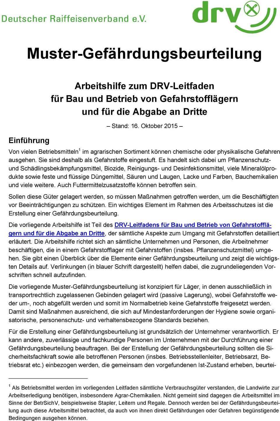 Die vorliegende muster gefährdungsbeurteilung ist konzipiert für läger in denen ausschließlich in transportrechtlich zugelassenen gebinden gelagert wird passive lagerung wobei gefahrstoffe we der um noch abgefüllt werden und somit im normalbetrieb keine gefahrstoffe freigesetzt werden.