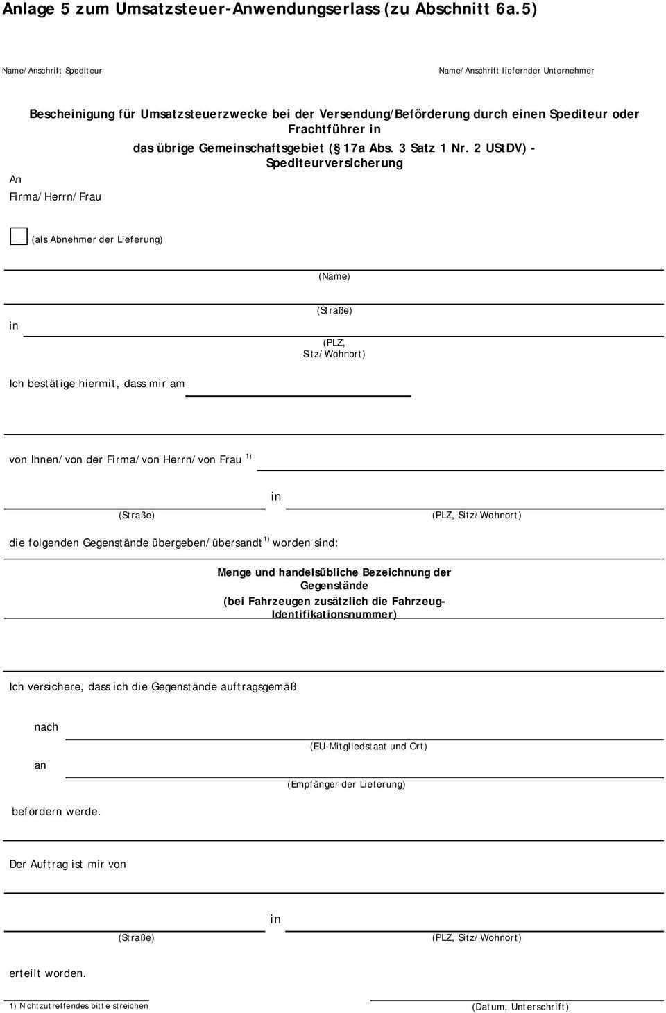 Ab dem 01 01 2020 existiert für innergemeinschaftliche lieferungen ein eu weit gleiches vermutungssystem zur annahme des geführten belegnachweises. Die belegführung ist allerdings im vergleich zur bestehenden nationalen rechtslage durchaus komplexer. Amtliches muster der spediteurbescheinigung hier finden sie das amtliche muster einer spediteurbescheinigung für umsatzsteuerzwecke bei der versendung beförderung durch einen spediteur oder frachtführer in das übrige gemeinschaftsgebiet 17a abs. Muster gelangesbestätigung deutsch nr.