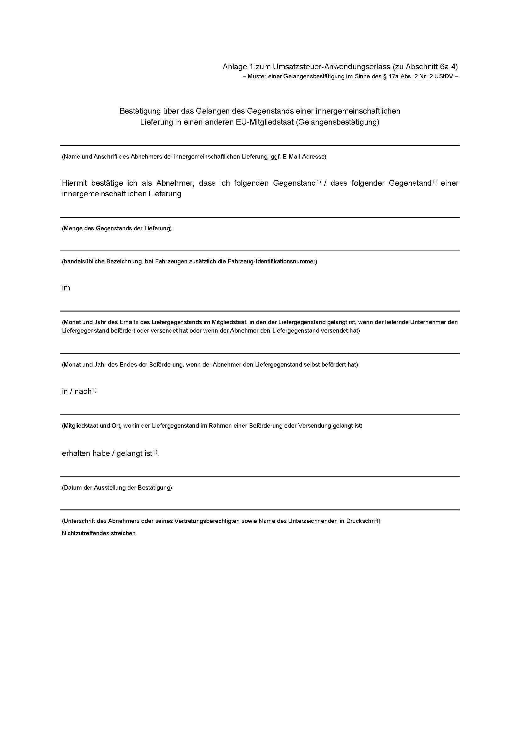 3570416 muster gelangensbestätigung französisch nr. Ab 1 10 2013 müssen deutsche lieferanten zusätzlich zur rechnung einen weiteren nachweis sog. 3570440 74a abs 3 ustdv nr. Hierbei handelt es sich um eine regelung die auf der vermutung basiert dass der gegenstand der lieferung als in das andere eu land als geliefert gilt.