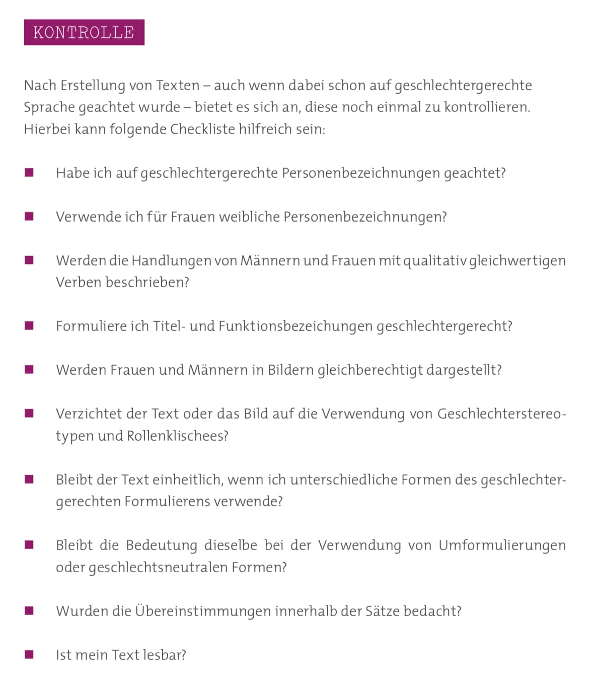 Punkte 1 3 sind varianten des geschlechtergerechten sprachgebrauchs die zwei klar definierte geschlechter nämlich frauen und männer weiblich und männlich reflektieren.