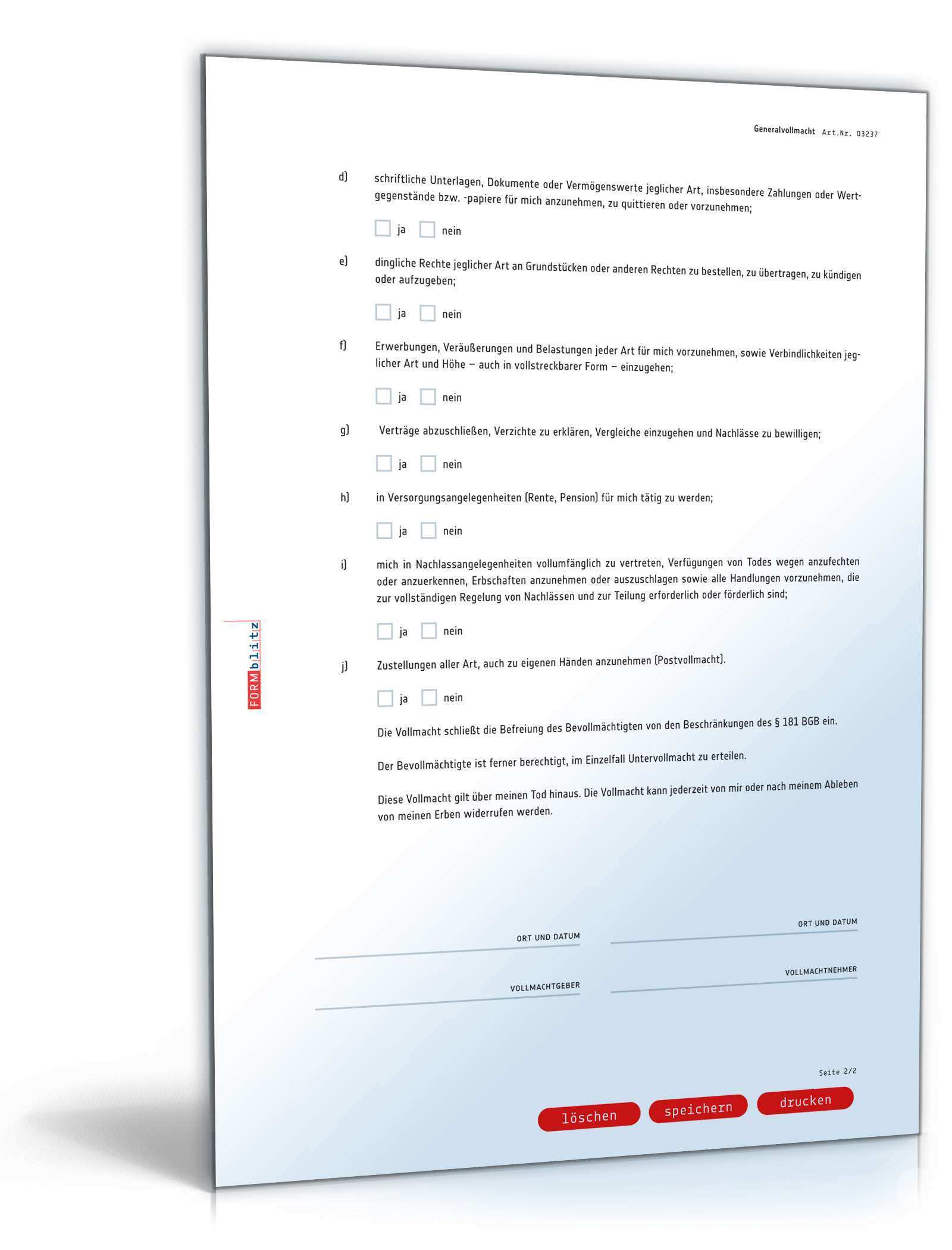 Generalvollmacht ueber den tod hinaus muster. Eine generalvollmacht geht meistens über eine prokura hinaus und wird nur dann bewilligt wenn der vollmachtgeber zum zeitpunkt der vollmachtausstellungen voll geschäftsfähig war. Banken allerdings die spezielle interne vorschriften einzuhalten haben verlangen stets die vorlage eines erbscheins oder notariellen testaments oder aber einer notariell beurkundeten vollmacht bevor sie jemandem zugriff auf ein konto einräumen. Die generalvollmacht ist zwar formlos über ihren tod hinaus wirksam und muss von jedem geschäftspartner akzeptiert werden. Sie ist somit gültig bis auf widerruf und kann auch über den tod eines ehepartners hinaus die gültigkeit behalten.