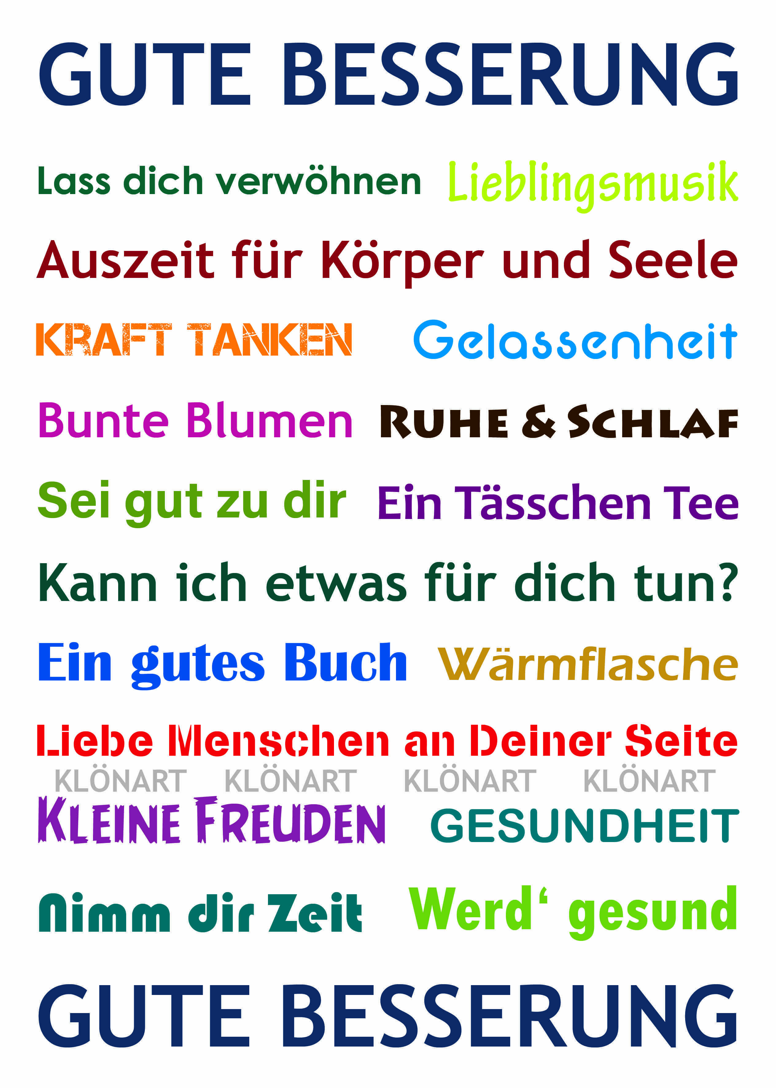 Was zählt ist die gute geste. Viele worte braucht es dazu nicht. Ob kollege mitarbeiter chef freundin oder eine andere person im bekanntenkreis die gesundheitlich angeschlagen ist jeder freut sich über aufrichtige genesungswünsche. 40 kostenlose gute besserung wünsche in neutraler und witziger form zum ausdrucken und weiterversenden jeder der krank ist eine op oder einen unfall hinter sich hat oder einfach nur gerade eine unangenehme phase in seinem leben durchmacht freut sich über gute besserung wünsche.