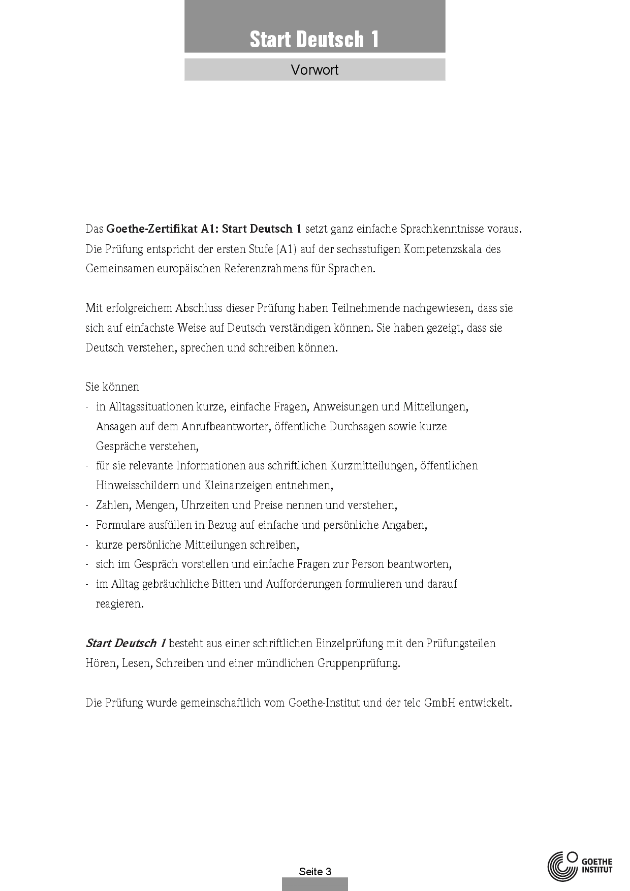 Die prüfung wurde gemeinschaftlich vom goethe institut und der telc gmbh entwickelt. Hier finden sie alle notwendigen informationen viele übungen zum goethe kursbücher. Start deutsch 1 zur vorbereitung auf das goethe zertifikat a1. Report goethe institut test a1 a2 please fill this form we will try to respond as soon as possible.