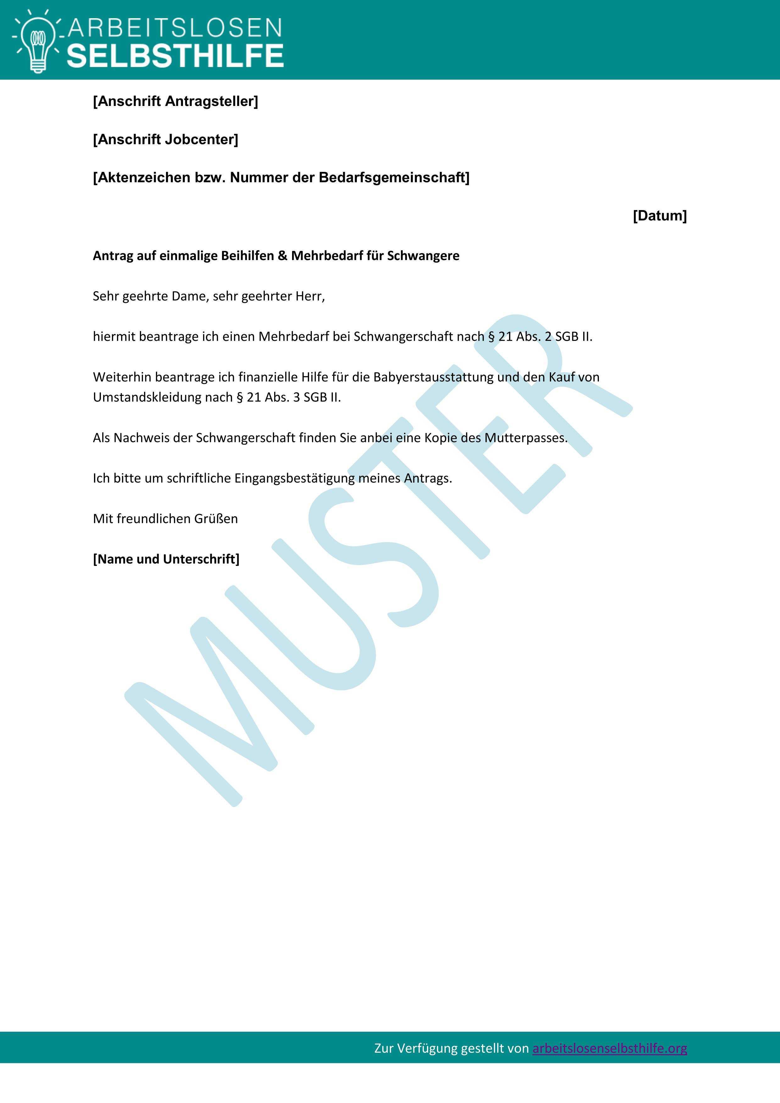 Antrag als muster zur orientierung. In bezug auf hartz 4 kann der antrag kompliziert sein muster können da abhilfe schaffen und sollen unterstützend wirken sodass sie sich mit dem richtigen wortlaut an das jobcenter wenden um ihren anspruch so durchsetzen zu können. Antrag auf mehrbedarf bei schwangerschaft und erstausstattung muster vorname nachname straße hausnummer plz wohnort. Folgende zuschüsse kommen in betracht.