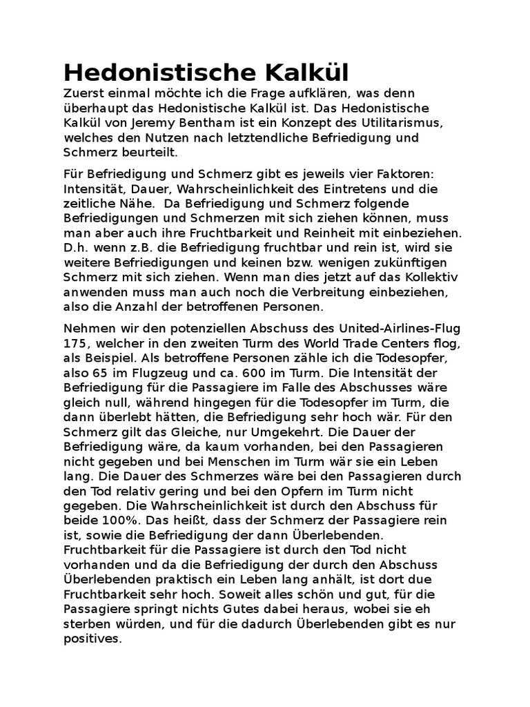 Das prinzip des hedonistischen kalküls ist mir bereits klar aber ich kann mir nicht vorstellen wie das auf ein beispiel übertragen aussehen soll.