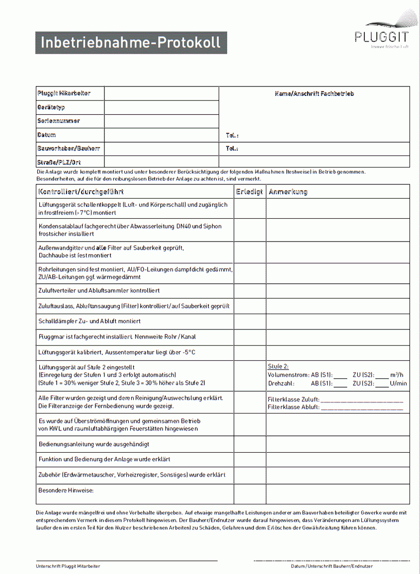 Checkliste und protokollformblatt für die inbetriebnahme der anlage und gleichzeitige einweisung des betreibers für funktionskontrolle erfassung von einstellwerten und beweissichere dokumentation zur bearbeitung vor ort.