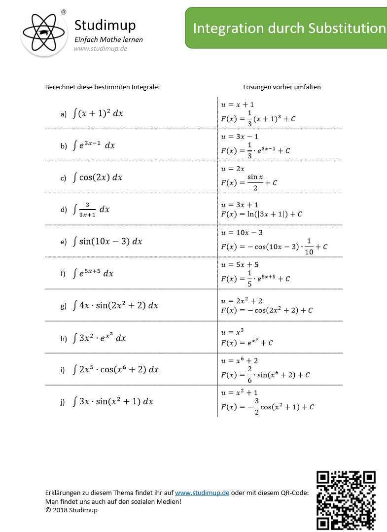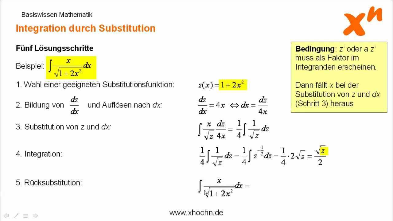 Beispiele zur substitution bei der integration. Lösung bestimmter integrale durch substitution die direkte anwendung der grundintegrale ist nicht immer möglich in solchen fällen hilft die methode der substitution. Integration durch substitution logarithmisches integrieren renate 2014 03 20 18 09 12 0100 das logaríthmische integrieren sollte einen eigenen artikel bekommen. Ziel der integration durch substitution ist es durch einführung einer neuen integrationsvariablen ein teil.