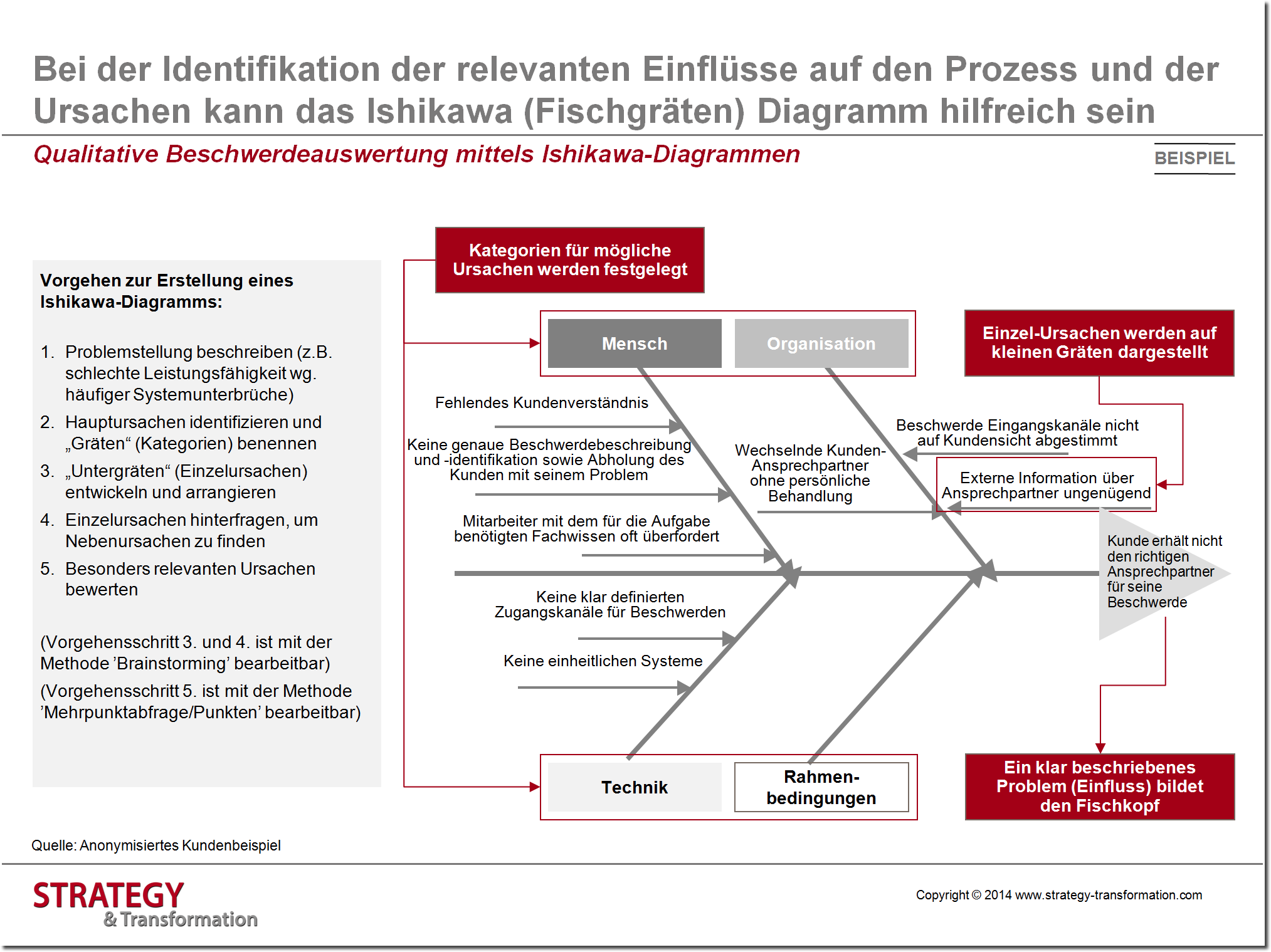 So können schwierigkeiten an der wurzel gepackt und aus der welt geschafft werden. Das ishikawa diagramm soll genau diesen prozess unterstützen indem es die einzelnen ursachen eines problems veranschaulicht und selbst komplizierte strukturen übersichtlich und verständlich abbildet. Das ishikawa diagramm visualisiert einen problemlösungsprozess bei dem nach den primären ursachen eines problems gesucht wird. Es steht ihnen grundsätzlich frei wie sie das ishikawa diagramm erstellen wollen.