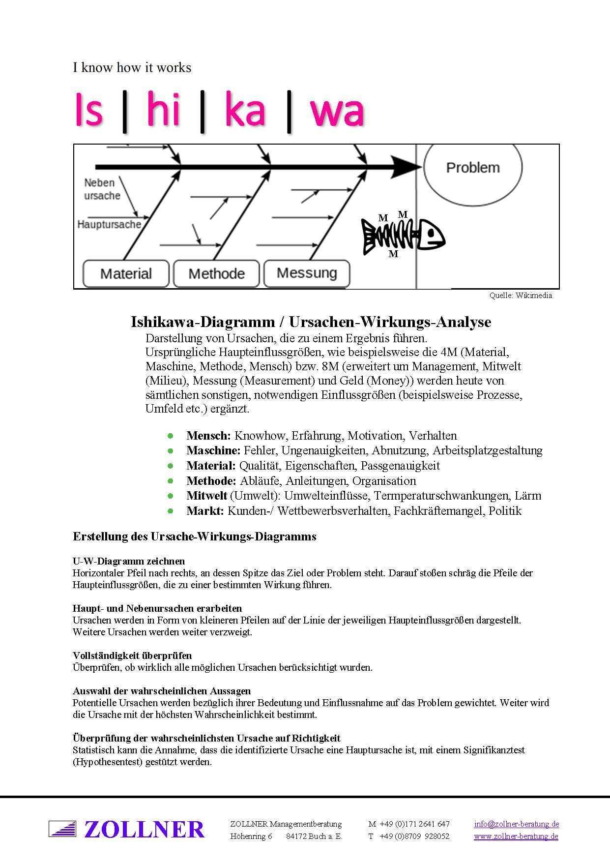 Probleme sind schnell ausgemacht die herausforderung besteht aber darin die richtigen schlüsse zu ziehen und entsprechend darauf zu reagieren. Die kausalitäten werden in form eines fischgrätendiagramms dargestellt. Im kopf wird das problem oder das ziel als thema formuliert. Das diagramm ist außerdem die treue grafische darstellung der 6m methode.