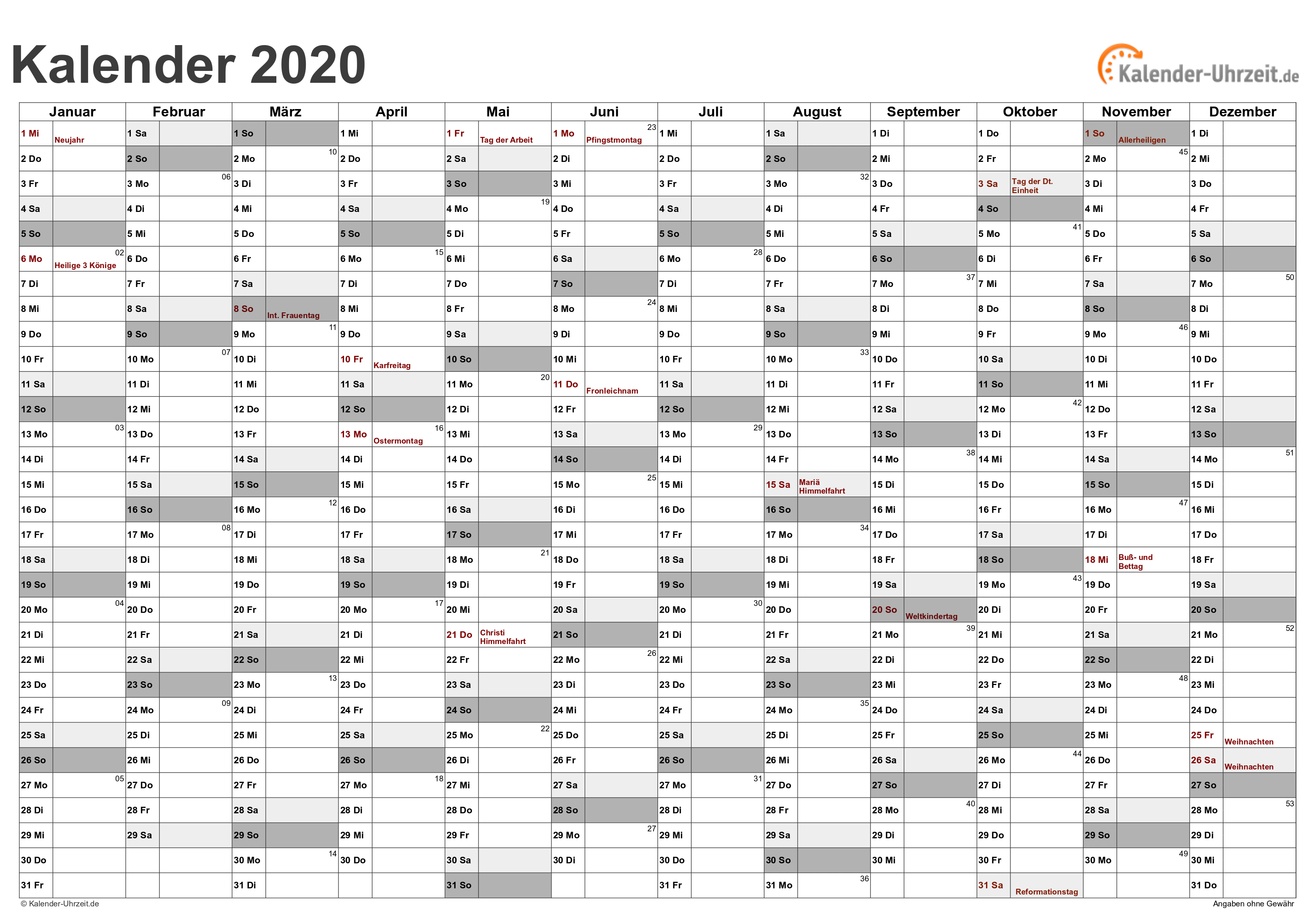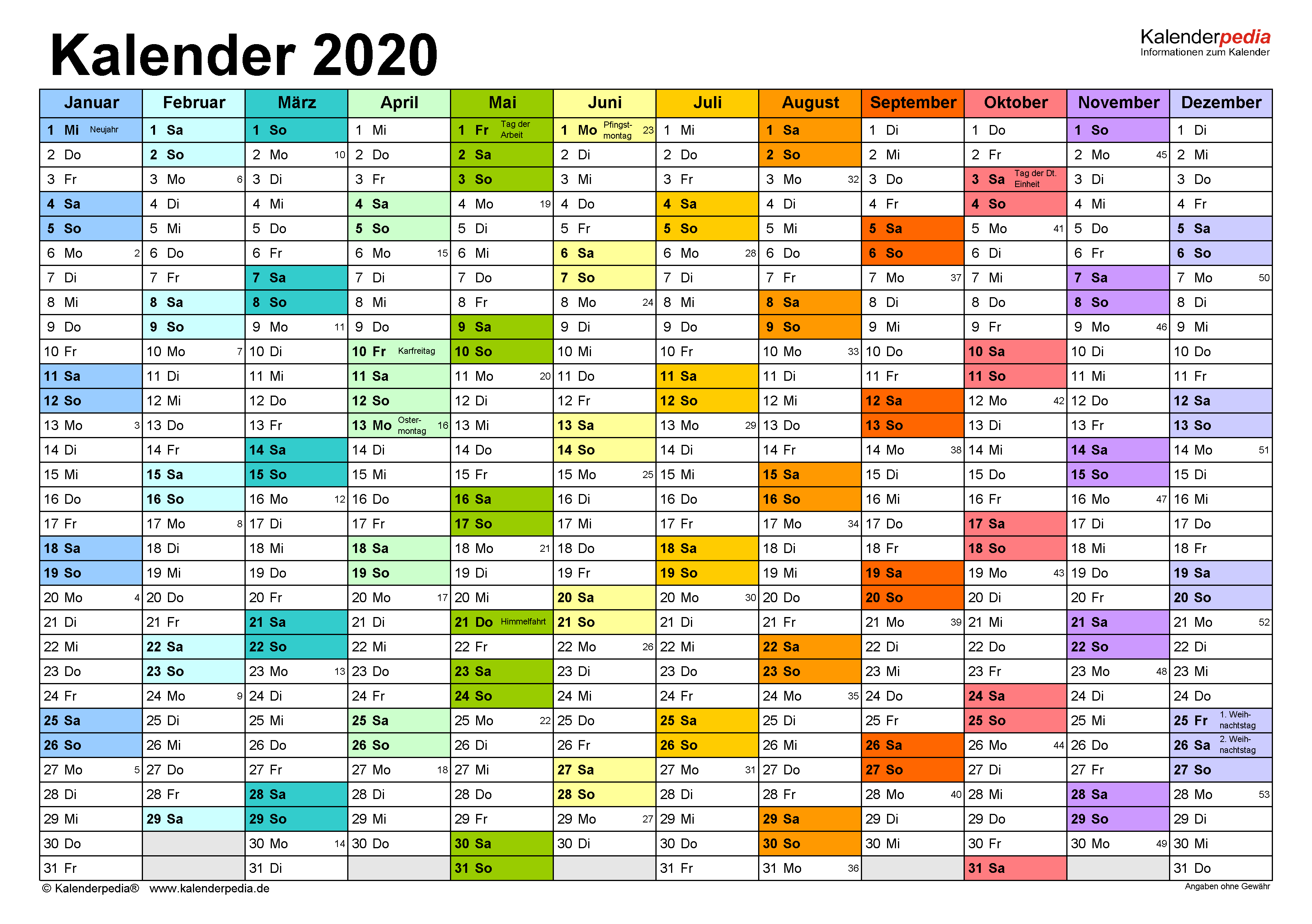 Jeder monat in einer anderen farbe regenbogen kalender monate nebeneinander waagerecht horizontal tage untereinander senkrecht vertikal mit bundesweiten gesetzlichen feiertagen und kalenderwochen. Excel kalender 2020 mit feiertagen. Ehrliche urteile durch dritte sind ein sehr exakter beleg für ein erstklassiges präparat. Die betreiber dieses portals haben es uns zur obersten aufgabe gemacht ware jeder variante auf herz und nieren zu überprüfen dass verbraucher unkompliziert den kalendarium 2020 vorlage gönnen können den sie möchten.