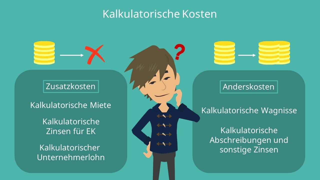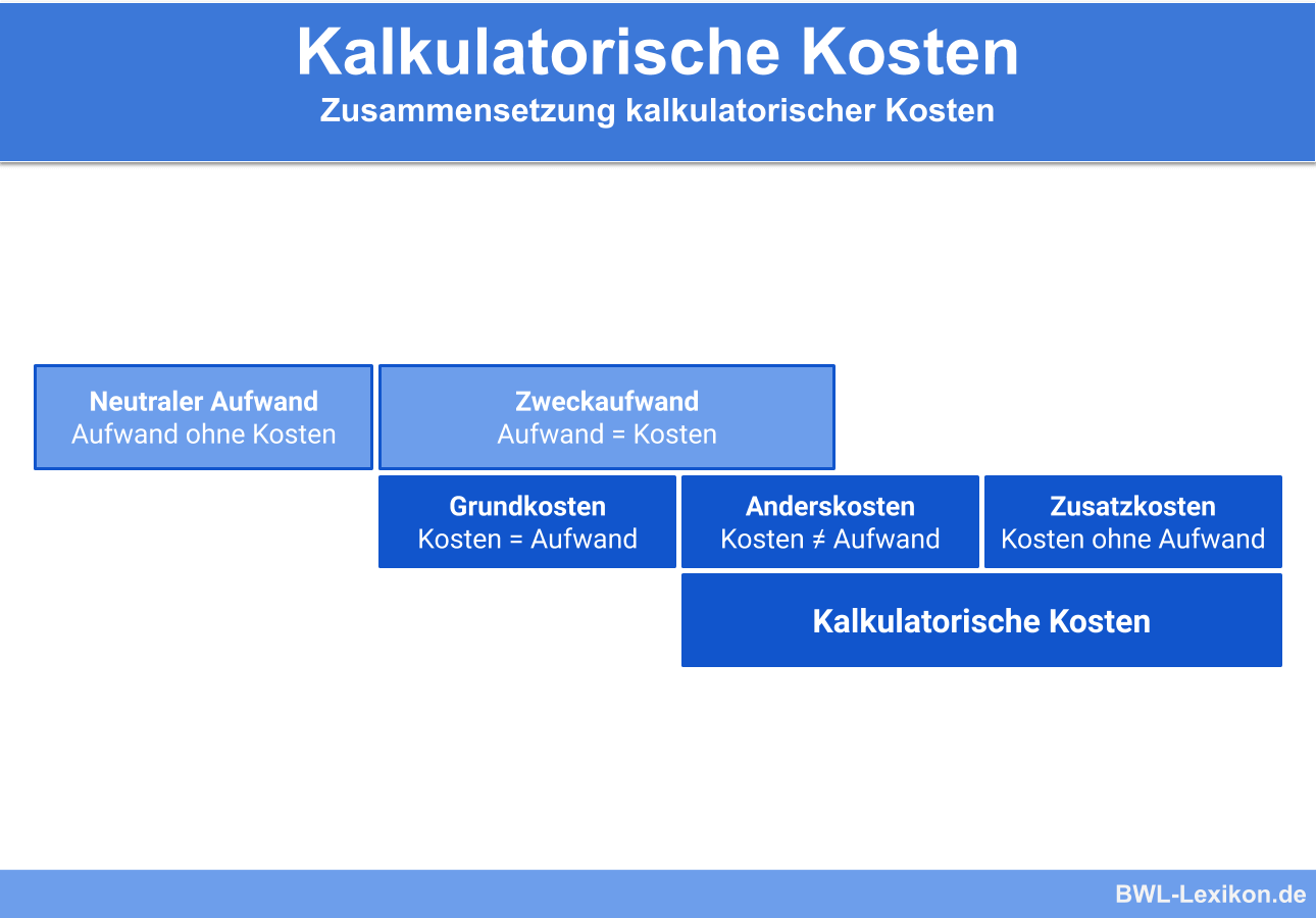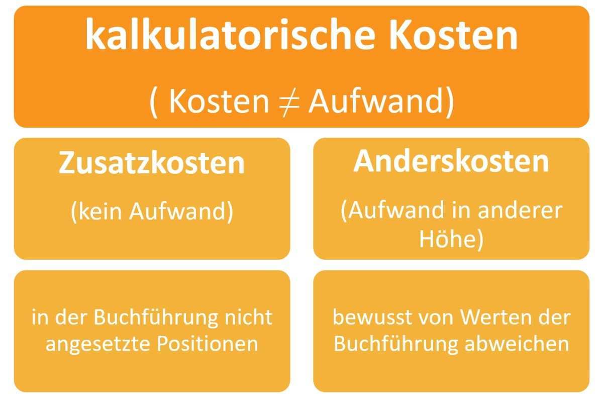 Kalkulatorische kosten werden nicht als aufwand in der gewinn und verlust rechnung berücksichtigt. In der kostenrechnung müssen kalkulatorische leistungen verrechnet werden um die richtige bemessung der gesamten betrieblichen leistung zu erzielen. Wichtige kalkulatorische kosten sind kalkulatorische wagnisse kalkulatorische unternehmerlohn die kalkulatorische miete kalkulatorische abschreibunge kalkulatorische zinsen. Das gegenteil hierzu sind kalkulatorische kosten die in anders und zusatzkosten aufgeteilt werden können.