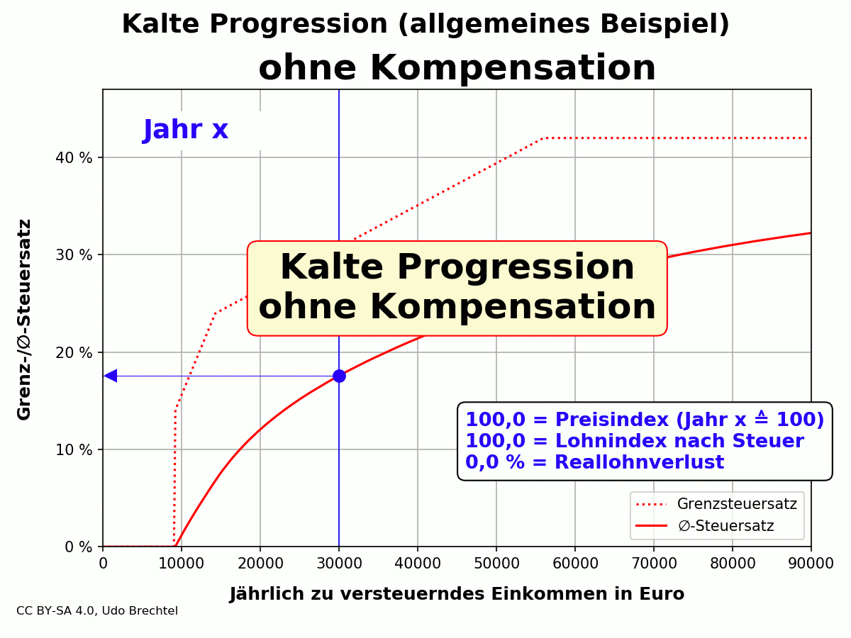 Ein einfaches beispiel zur erklärung der kalten progression. Allgemeines beispiel 1 änderung des realeinkommens durch die kalte progression bei einer angenommenen preissteigerungsrate von 2 und einer lohnerhöhung in der nebenstehenden grafik ist vereinfachend eine inflation von 2 angenommen. Entsteht eine kalte progression im weiteren sinne gelangt die gesamte gesellschaft in eine höhere einkommensteuerklasse. In österreich ist der lohn bzw.