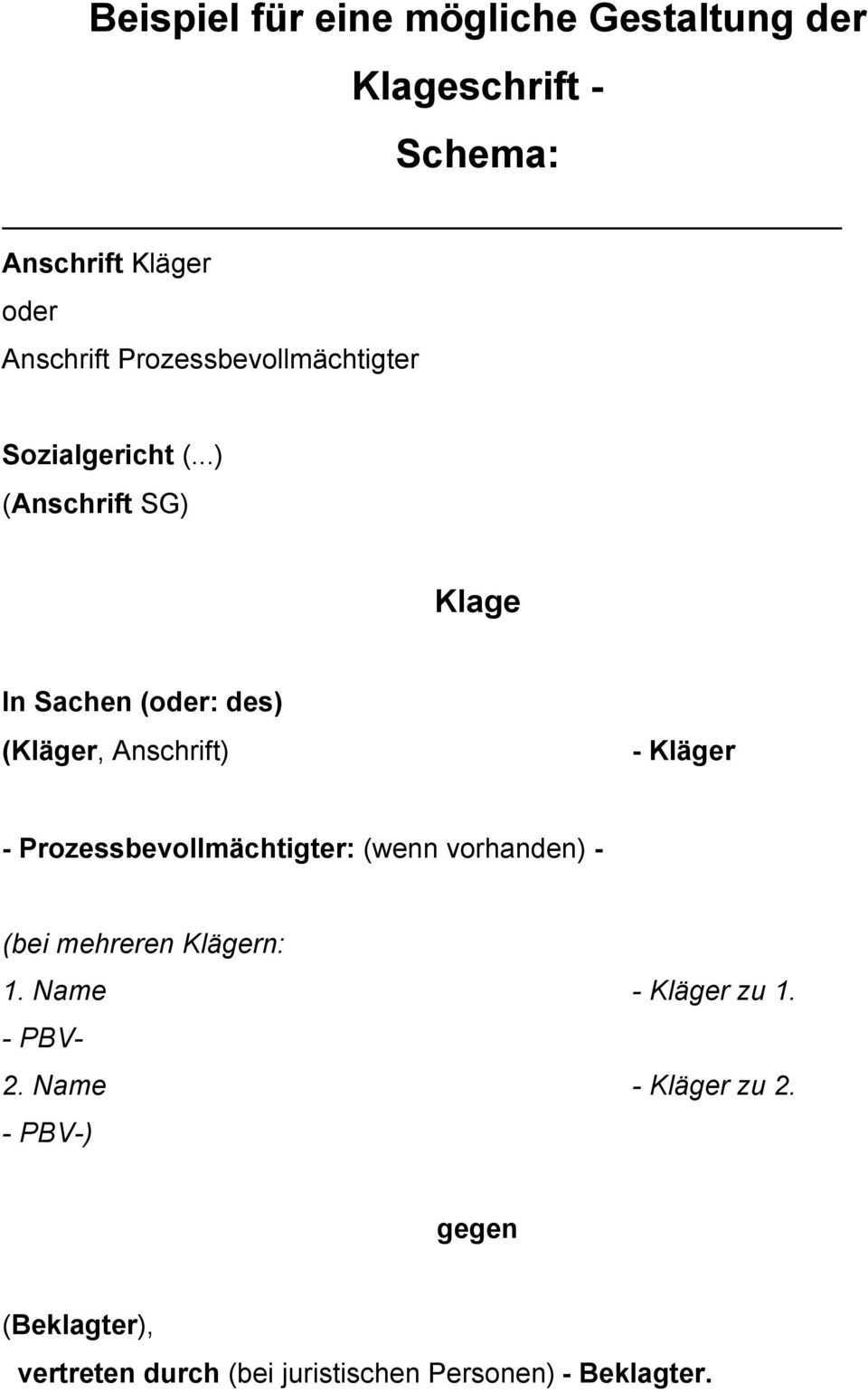Diese musterformular können sie für alle klagen beim sozialgericht für eine zunächst fristwahrende klage verwenden und sollten den widerspruchsbescheid in kopie beifügen. Im streit um die pflegestufen hat dieser wahlspruch seine volle gültigkeit. Klage vor dem sozialgericht für entscheidungen der sozialverwaltungen und für die überprüfung der rechtmäßigkeit der entsprechenden vorgänge sind die sozialgerichte zuständig. 50 48653 musterstadt sozialgericht muster anschrift ergibt sich aus der rechtsbehelfsbelehrung musterstr.