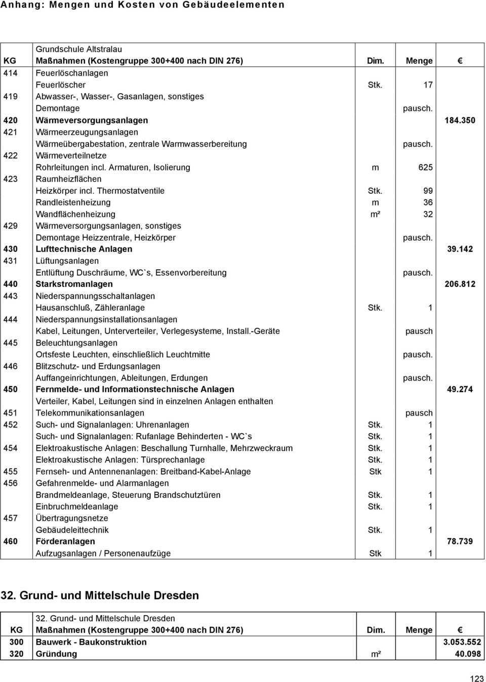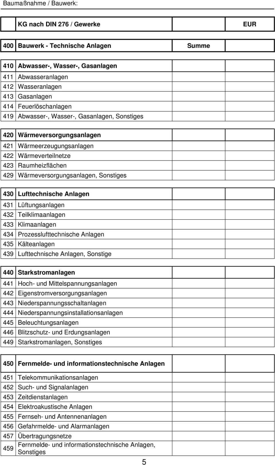 Hochbau dezember 2008 und din 276 4 teil 4. Beispiel f r die auswertung der baukosten sp a l te c sp a l te d sp a l te e sp a l te f 400 bauwerk technische anlagen. 1 30 000 00 30 000 00 3 300 bauwerk baukonstruktion summe 475 487 50. Kostenberechnung 20 kostenanschlag jetzt bepreisung lv 10.