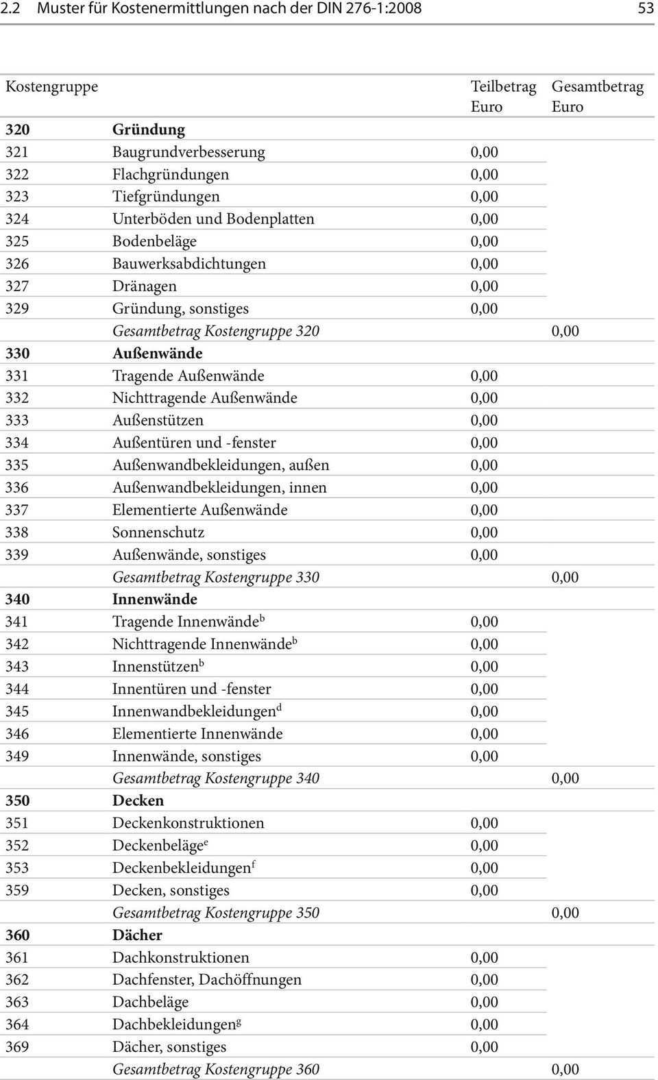 Ebene der kostengliederung ermittelt werden. Kostenberechnung din 276 2018 12 gesamtkosten nach kostengruppen in der dritten ebene der kostenvoranschlag din 276kosten vor anschlag din 276 1 20081 2008 12 12 gesamtkosten nach kostengruppen mindestens bis zur 3. Kostengruppen leistungsbereiche gesamt davon nicht zutreffendes streichen kosten unbare bare fehlende kostenpositionen ergänzen eigenleistungen grundstück herrichten und erschließen baugrube gründung außenwände innenwände decken dächer baukonstruktive einbauten summe bauwerk. 1 200 herrichten und erschließen summe 30 000 00 2 abbruchmaßnahmen pschl.