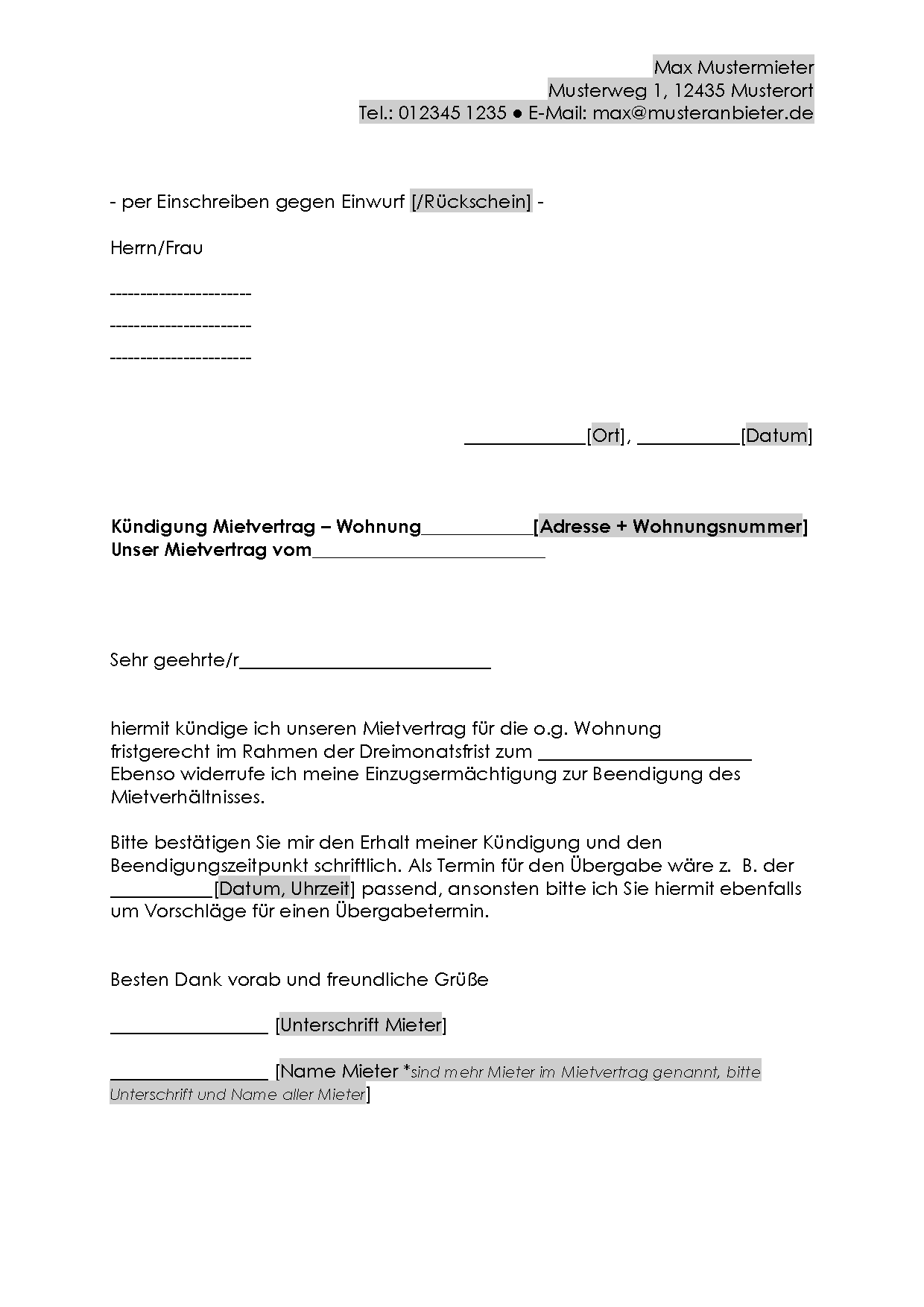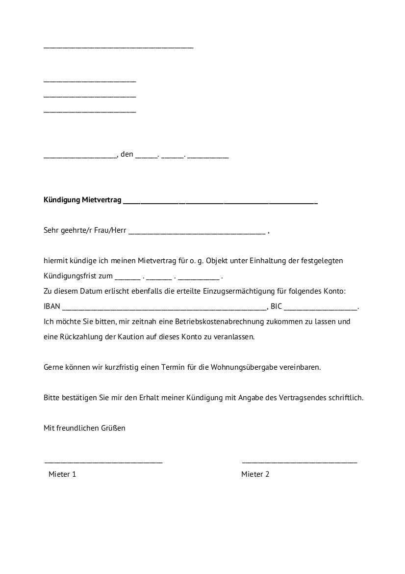 Verpasst der mieter die kündigungsfrist knapp so dass die kündigung den vermieter um 1 oder 2 werktage zu spät erreicht verschiebt sich die kündigung um 1 monat also hier im beispiel auf den 30 11 2019. Unsere muster helfen ihnen dabei die kündigung ihres mietvertrags vollständig und rechtmässig zu verfassen. Mit dem ausfüllbaren formular erhältst du ein fertiges mietvertrag kündigungsschreiben als pdf oder word zum ausdrucken. Weil der eine mieter gar nicht vor ort ist dann ist es sicherer wenn derjenige eine schriftliche vollmacht zur kündigung des mietvertrags schreibt und an den bevollmächtigten mieter schickt und dann dieser mieter im namen beider aller andern mieter kündigt und die originalvollmacht dem kündigungsschreiben beifügt.