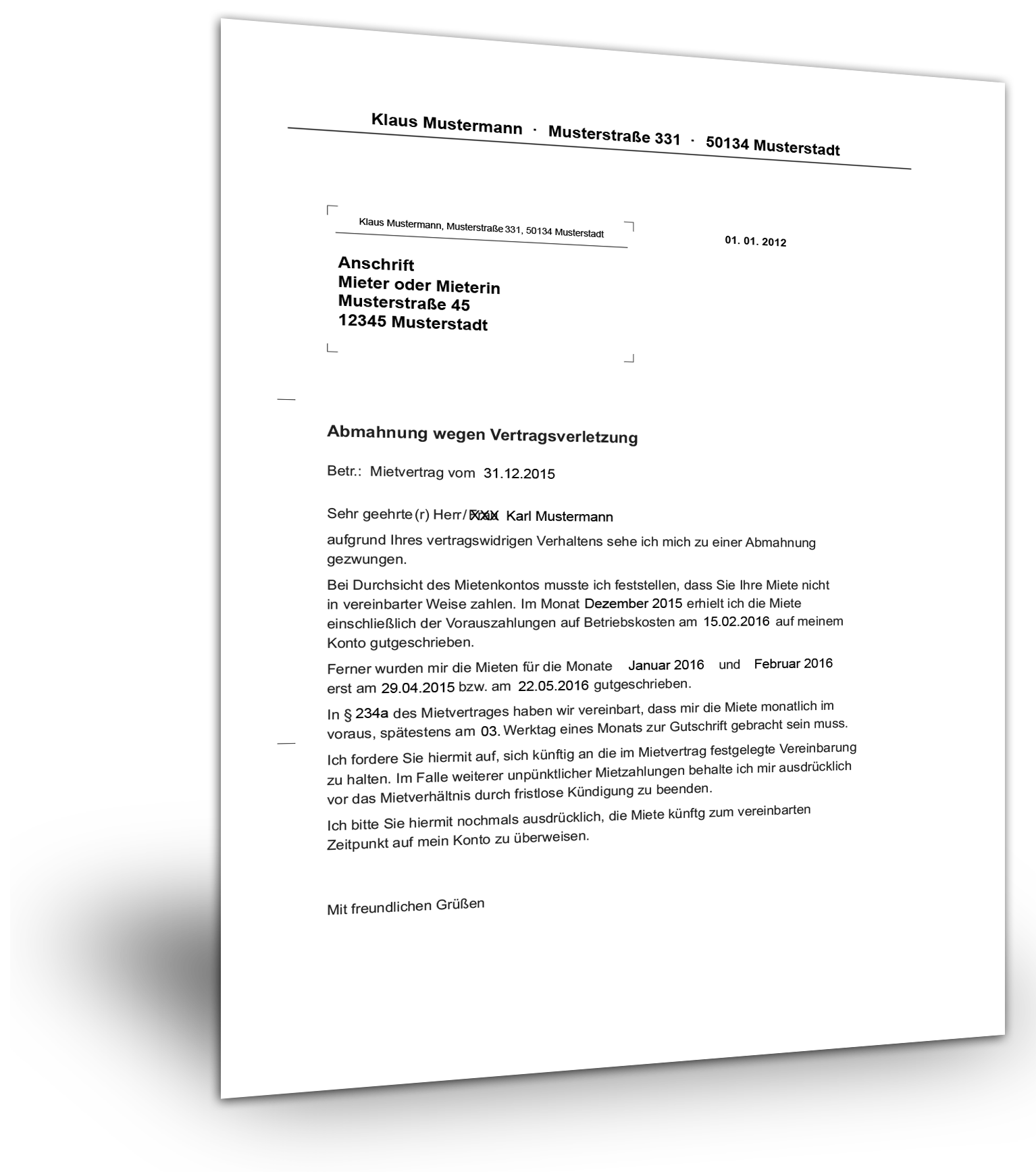 Fristlose kündigung wegen wiederholter verspäteter mietzahlung 16 03 2012 1 minute lesezeit. Außerordentliche fristlose kündigung wegen unpünktlicher mietzahlung. Kündigung wegen verspäteter mietzahlung muster stornierung wegen verspäteter mietzahlung muster zugleich wird eine abmahnung für unpünktliche mietzahlungen erklärt da eine wiederholte nichtzahlung oder verspätete zahlung ebenfalls zu einer kündigungsmöglichkeit ohne einhaltung einer kündigungsfrist führt. Unser muster für eine außerordentliche fristlose kündigung wegen ständig unpünktlicher mietzahlungen des mieters die mit einer hilfsweise erklärten ordentlichen kündigung verbunden ist ermöglicht es vermietern von wohnraum das kündigungsschreiben unkompliziert und ohne viel zeitaufwand zu verfassen.