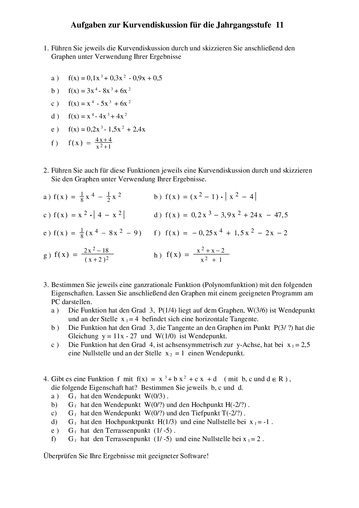 In diesem text schauen wir uns ein beispiel einer typischen kurvendiskussion an. Zum polynom mit der gleichung f x x3 3x2. Aufgaben zur kurvendiskussion für die jahrgangsstufe 11. Wir gehen mit dir schritt für schritt die zu bearbeitenden punkte durch.