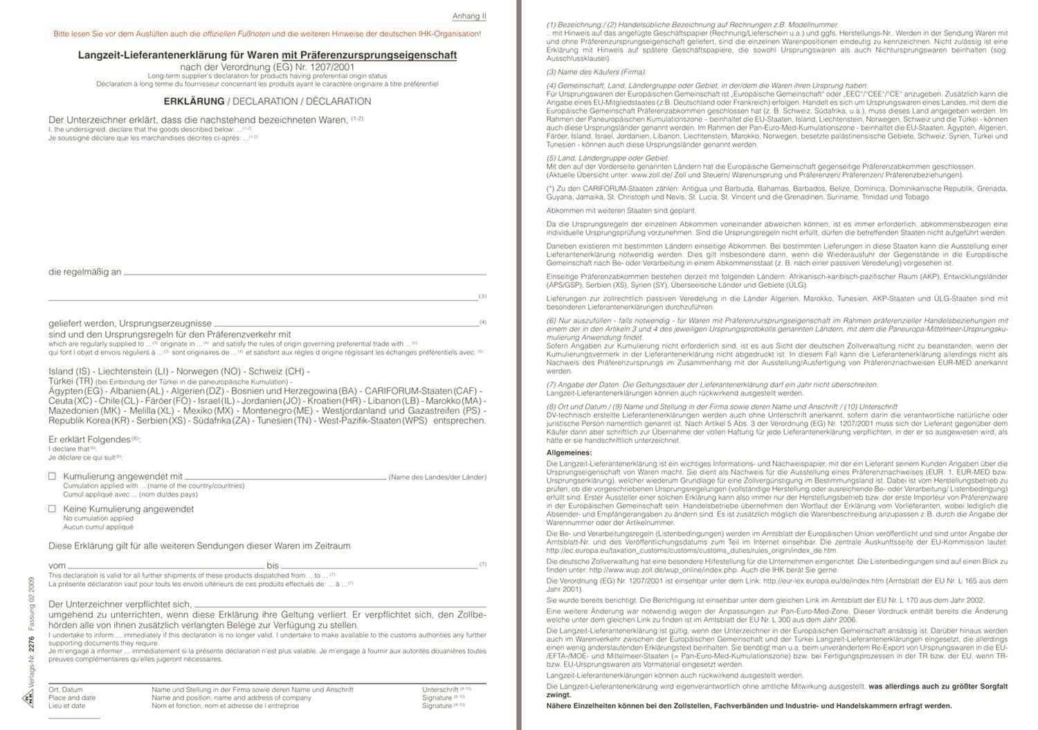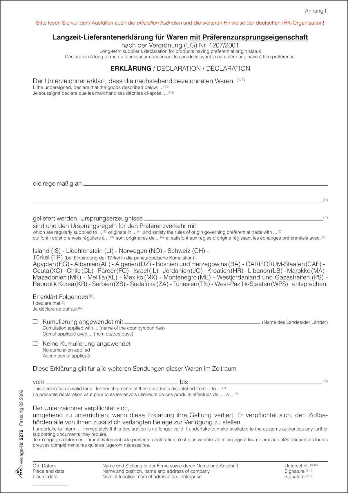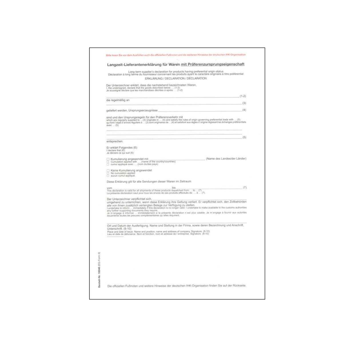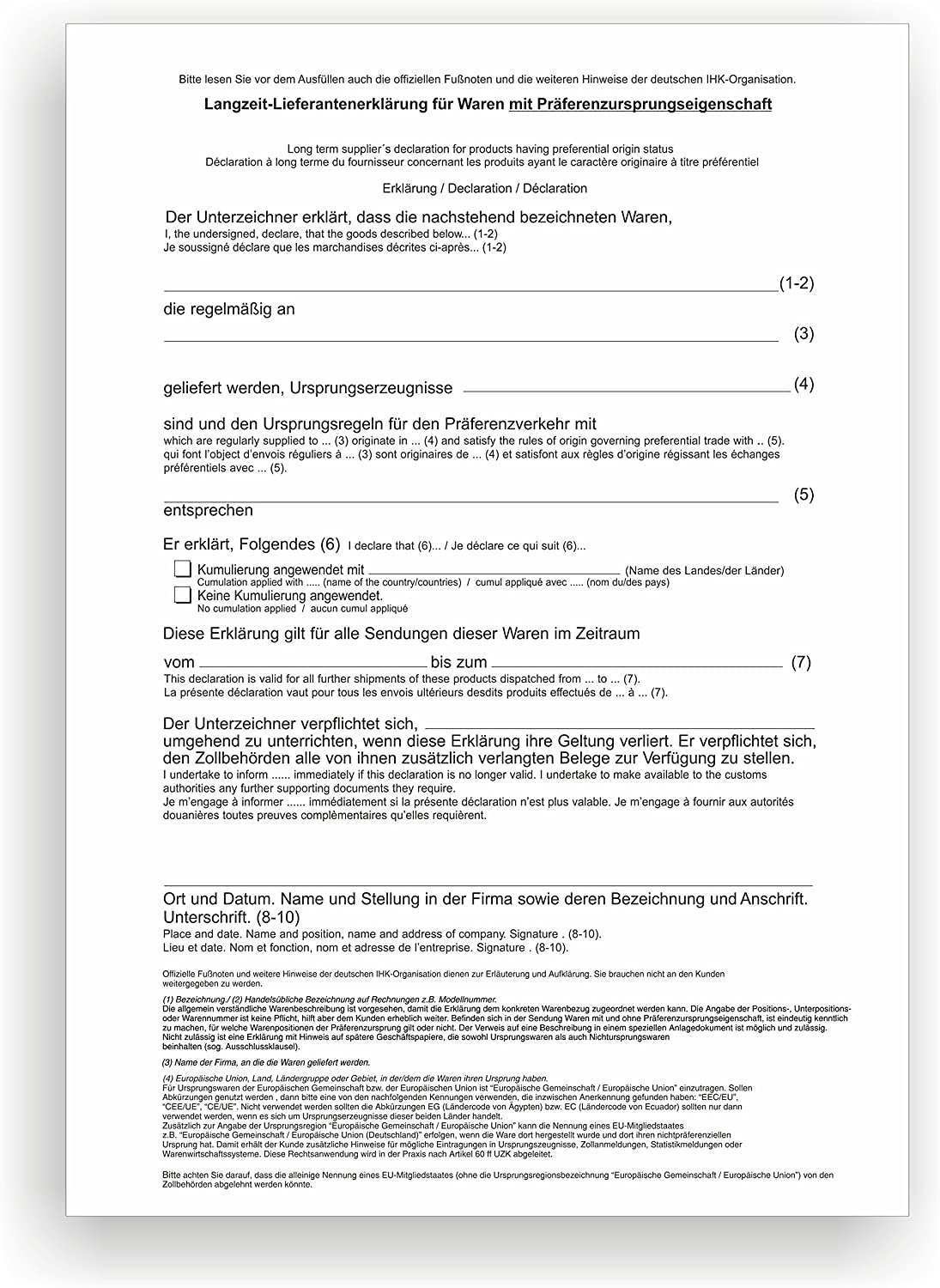 Langzeit lieferantenerklaerung muster ausgefuellt. Merkblatt langzeit lieferantenerklärung lle ausfüllen. In der lieferantenerklärung für waren mit vorzugsursprungseigenschaft ist der ursprung im sinne der jeweiligen vereinbarung anzugeben dies geschieht durch auflistung der jeweiligen vertragsstaaten für die die ursprungsregeln aus den jeweiligen verarbeitungslisten tatsächlich erfüllt sind. Langzeit lieferantenerklärung formular vordruck vorlage. Die formulare der ihk organisation zum ausstellen von langzeit lieferantenerklärungen für waren mit präferenzursprungseigenschaft wurden aktualisiert und stehen den unternehmen ab sofort zur verfügung.