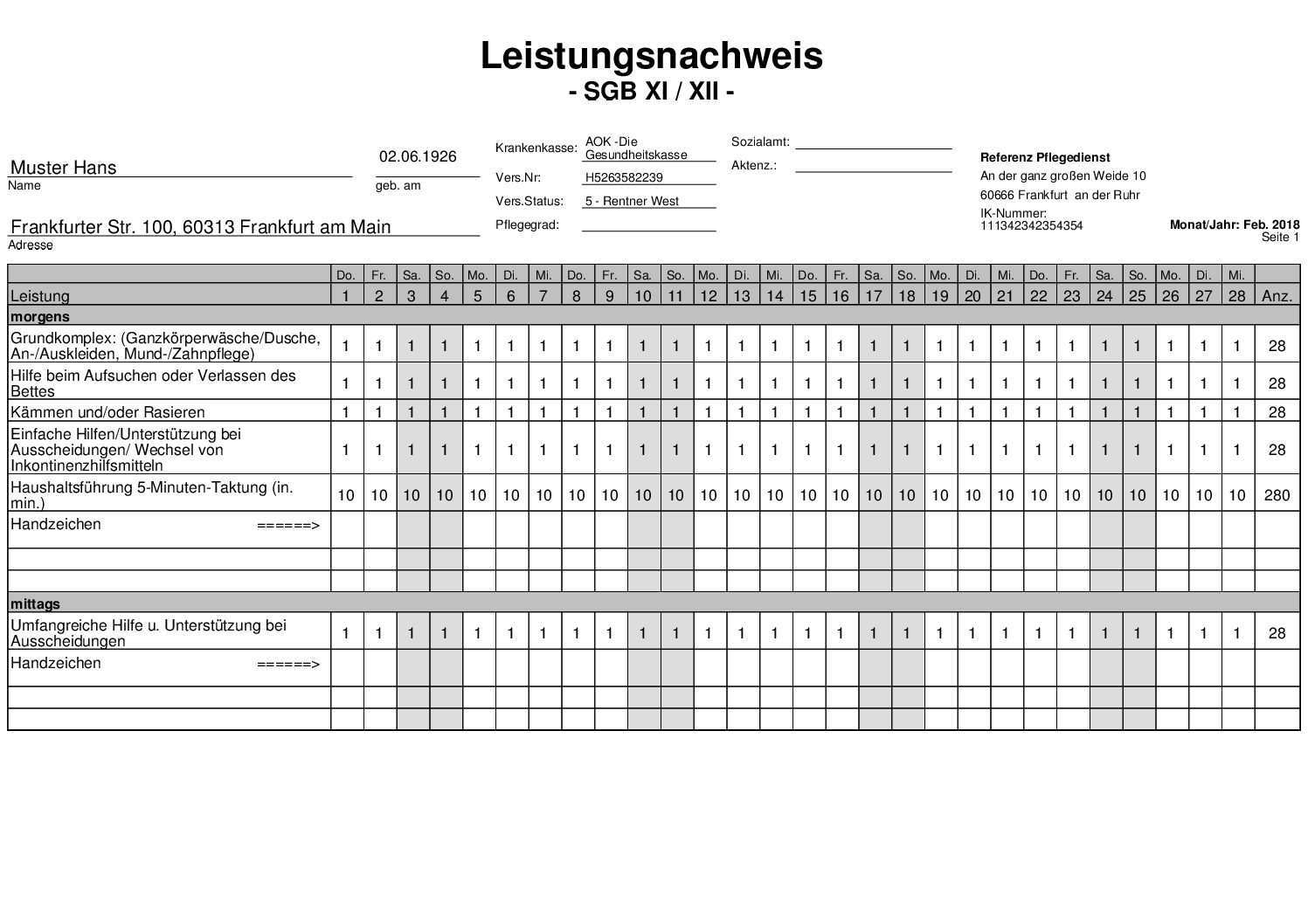Auf dem leistungsnachweis werden alle vertraglich vereinbarten leistungen des pflegedienstes für jeden tag des monats aufgeführt. Kumentation für die ambulante pflege erarbeitet werden. Einige von ihnen sind essenziell für den betrieb der seite während andere uns helfen diese website und die nutzererfahrung zu verbessern tracking cookies. Zeitkorridor bei anwesenheit bis zu 4 5 stunden am tag ein anspruch auf eine abwesenheitsvergütung besteht nur wenn der pflegeeinrichtung die vorübergehende.