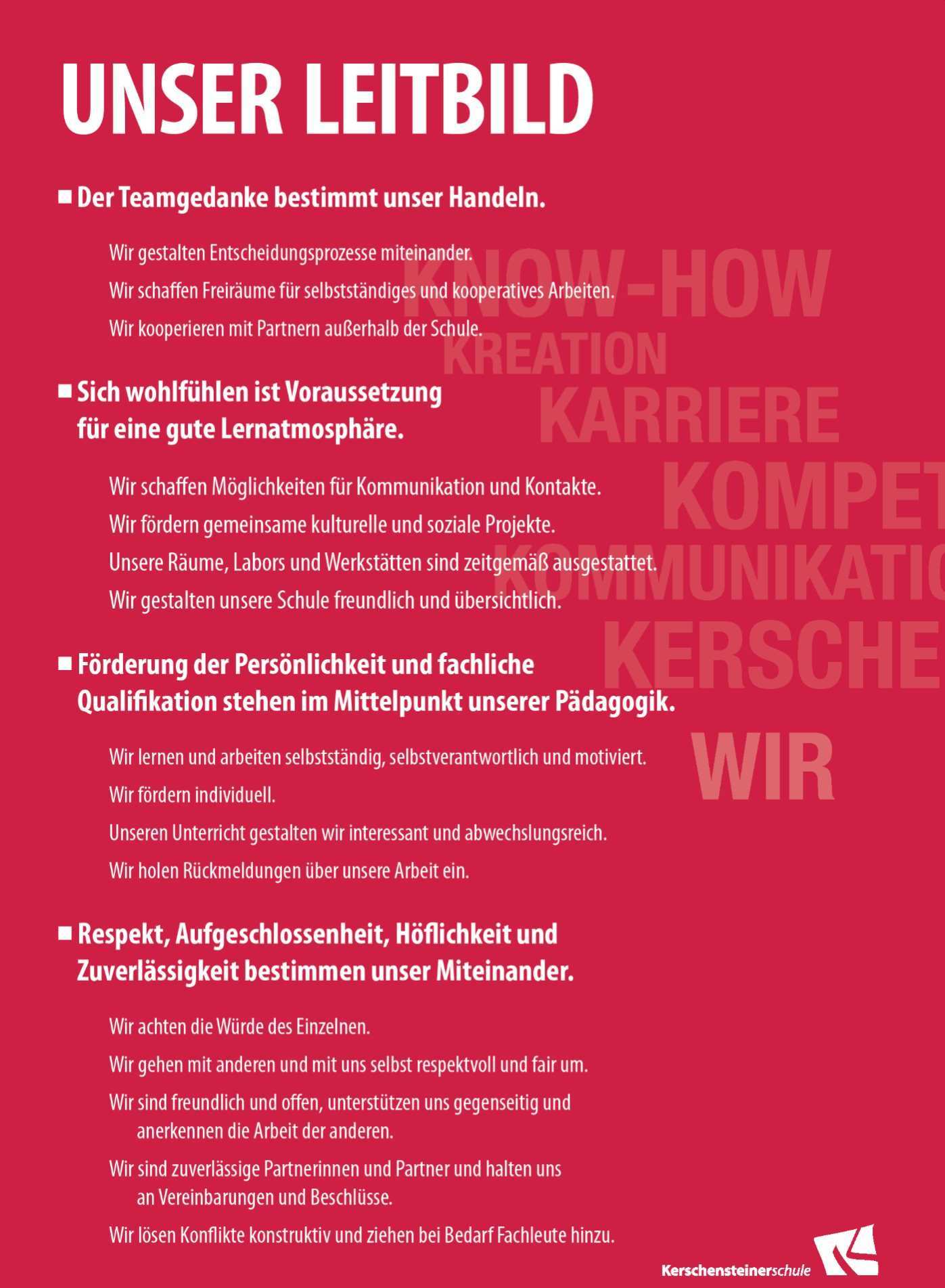 Für die öffentlichkeitsarbeit hat das leitbild die funktion zu beschreiben wofür das unternehmen steht. Wir bieten vorbildliche anstellungsbedingungen und fördern die entwicklung und gesundheit unserer mitarbeitenden. Wir erstellen kreative und wirkungsvolle marketingkampagnen. Der sozialen verantwortung gegenüber unseren mitarbeitenden tragen wir rechnung.