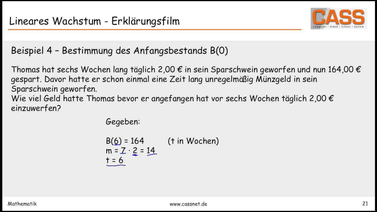 Sie beschreibt lineares wachstum. In einen tümpel der anfangs 200 m 3 dreckiges stinkendes wasser enthält fließen täglich 4 m 3 sauberes kristallklares wasser dazu. Lineares wachstum wird einfach durch unsere bekannte geradengleichung beschrieben.