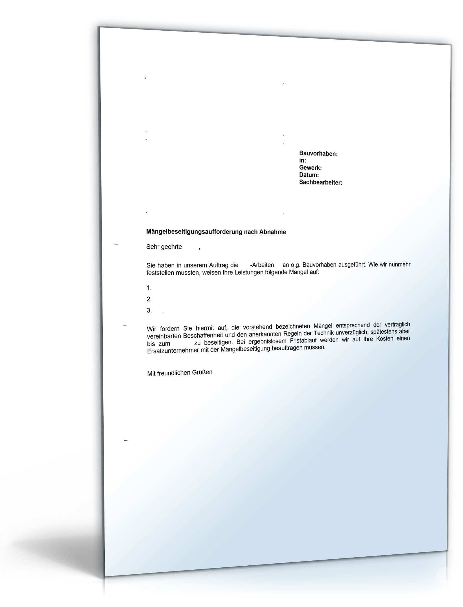 Anstatt ihnen die formalien zu erklären haben wir ein mängelanzeige vob muster erstellt. Wir übernehmen keine verantwortung für vollständigkeit sowie inhaltliche und technische fehlerfreiheit. Der zustand des mietobjektes der tatsächlich vorgefunden wird entspricht dann dem. Wenn anschließend der handwerkerfirma eine frist zur nachbesserung gesetzt und eine eventuelle selbstvornahme angezeigt wird können nach erfolglosem fristablauf die mängel entweder selbst behoben oder ein anderer handwerker mit der mängelbeseitigung beauftragt.
