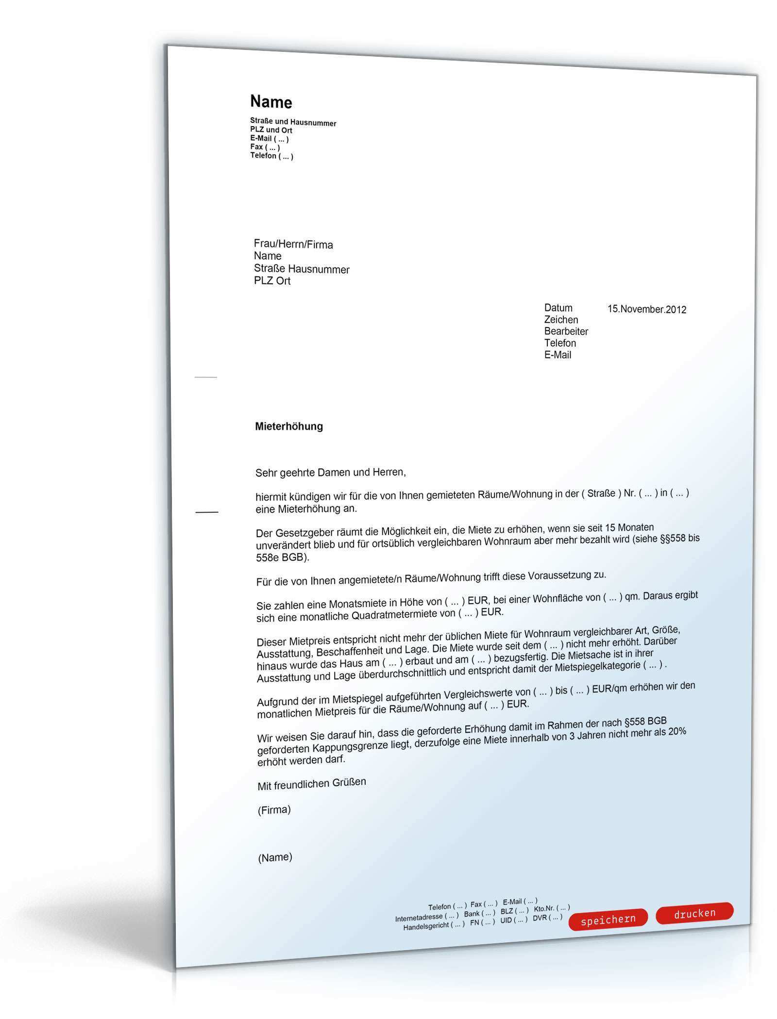 Mieterhöhung nach 558 bgb vergleichsmiete zur wohnung xy. Bitte beachten sie dass dieser text ein unverbindliches muster darstellt und im konkreten einzelfall gegebenenfalls ergänzt werden muss. Nicht für privatpersonen herausgegeben vom landesverband haus grund westfalen e v hagen. Anschrift des vermieters 1.
