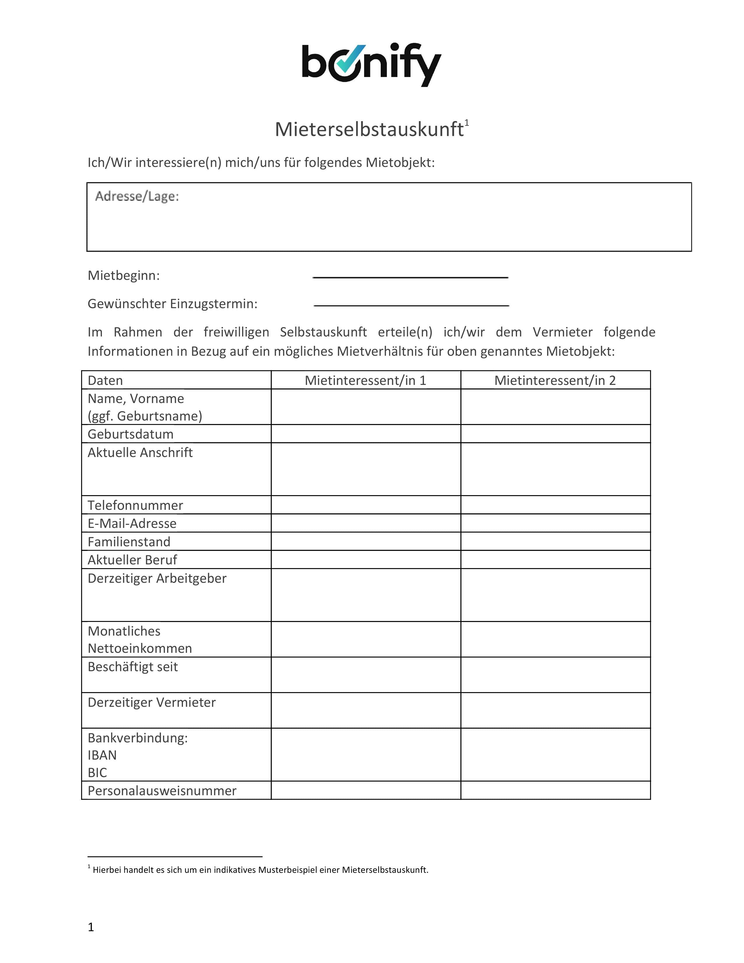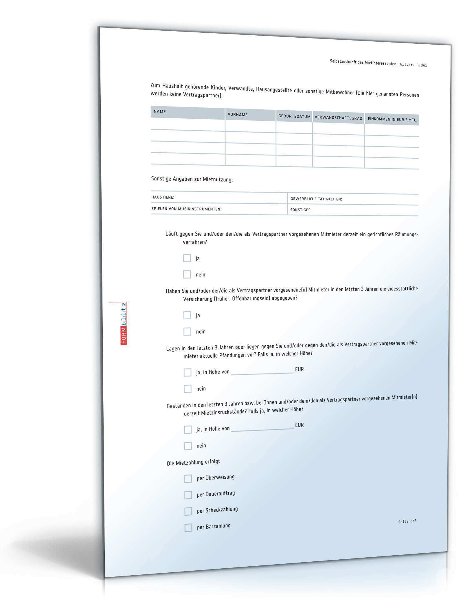 Trotz dsgvo spielen mieterselbstauskunft und die bonitätsauskunft der schufa weiterhin eine wichtige rolle bei der wohnungssuche. Mieter selbstauskunft ein service von www mietrecht de mieter selbstauskunft ich wir sind an der anmietung des objektes ab dem schon erst ab dem interessiert. Dennoch schießen einige vermieter über das ziel hinaus und erheben daten die über ein erforderliches maß hinausgehen. Aus diesem grund habe ich dir hier ein muster als pdf hochgeladen das du beschreiben kannst.