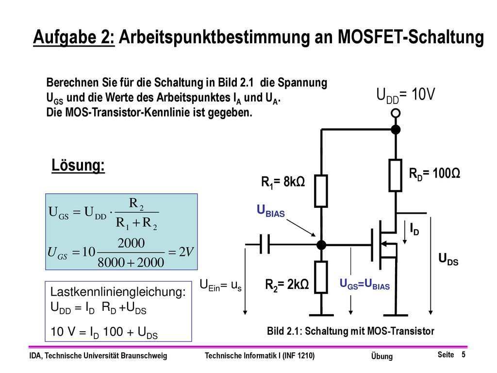 R1 100ω und die source drain strecke des mosfet bilden einen spannungsteiler. Nach dem ohmschen gesetz gilt für einen spannungsteiler.