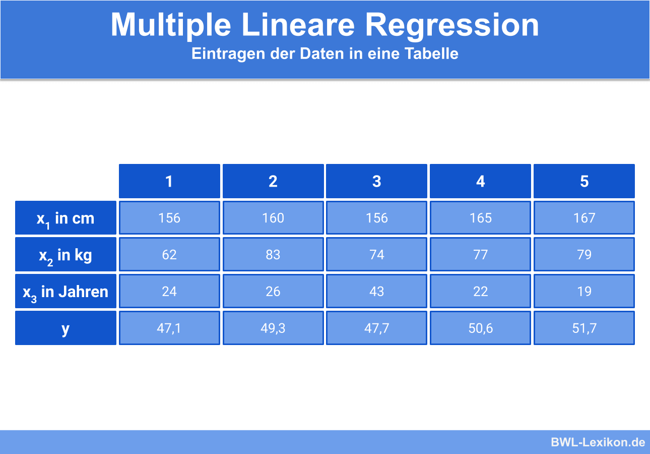 Genauso wie in der einfachen linearen regression können die parameter in anderen büchern skripten anders benannt sein z b. Ein beispiel dafür ist die körpergröße. Stock index price 1798 4040 345 5401 x 1 250 1466 x 2. You can use this information to build the multiple linear regression equation as follows.