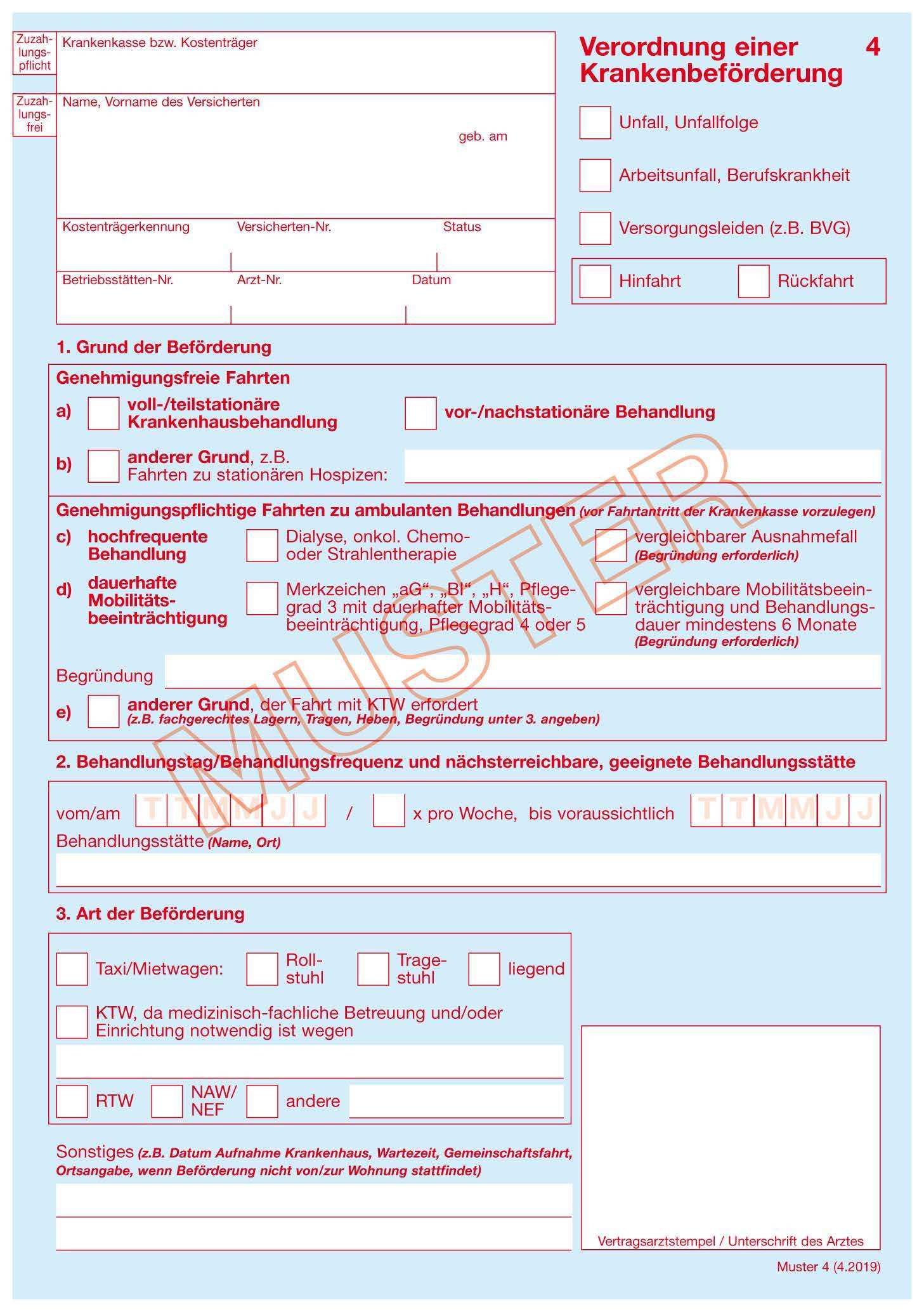 Nach von nach von nach von nach von nach von nach von nach. Für die praxis verordnung einer krankenbeförderung muster 4 verordnung einer krankenbeförderung muster 4 hier geben wir ihnen das neu aufgesetzte formular verordnung einer krankenbeförderung muster 4 zur kenntnis welches ab dem 01 07 2020 zu verwenden ist und somit das bisher gültige formular ersetzt.