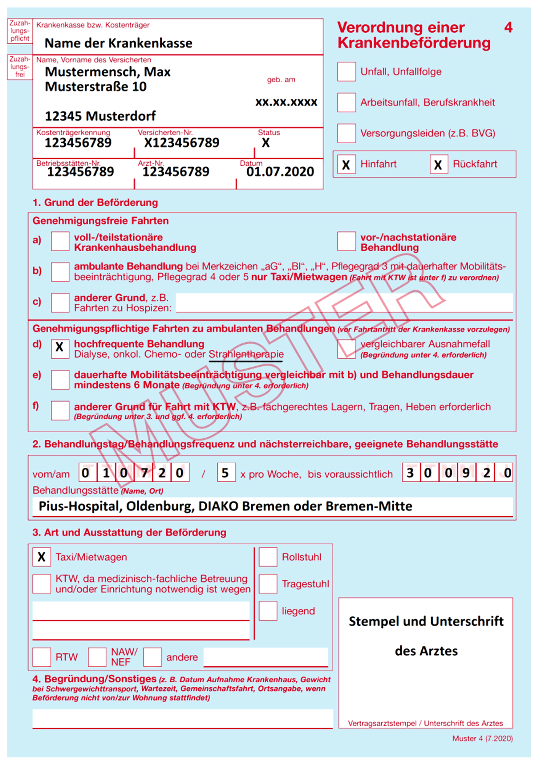 Muster 4 krankenbefoerderung. Vordruckerläuterungen zu muster 4 zum 01 07 2020 7 das ankreuzfeld ist auch zu nutzen sofern für versicherte mit einem merkzeichen ag bl h oder pflegegrad 3 mit dauerhafter mobilitätsbeeinträchtigung pflegegrad 4 oder 5 eine fahrt im ktw erforderlich ist. Ohne hilfe können diese menschen nicht am alltäglichen leben teilnehmen. Für diese zwecke bieten die krankenkassen an die kosten des transports ganz oder teilweise zu übernehmen. Bestätigung durch den versicherten ich bestätige die durchführung der im folgenden aufgeführten fahrten datum bestätigun d die krankenbefö durchgeführt.