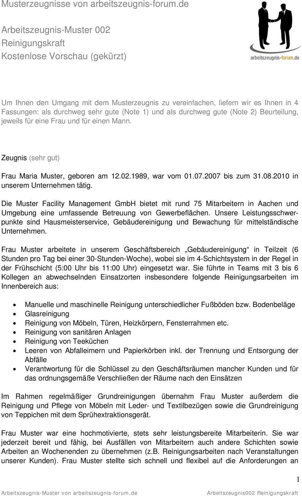 Zudem bieten wir auch eine vorlage für ein zwischenzeugnis kostenlos an. Am war vom bis in meinem unternehmen auf geringfügiger basis als hausmeister reinigungskraft beschäftigt. Musterzeugnisse von arbeitszeugnis forum de arbeitszeugnis muster 002 reinigungskraft kostenlose leseprobe inhalt arbeitszeugnis muster reinigungskraft weibl. Arbeitszeugnis muster von arbeitszeugnis forum de arbeitszeugnis002 reinigungskraft 4 4.