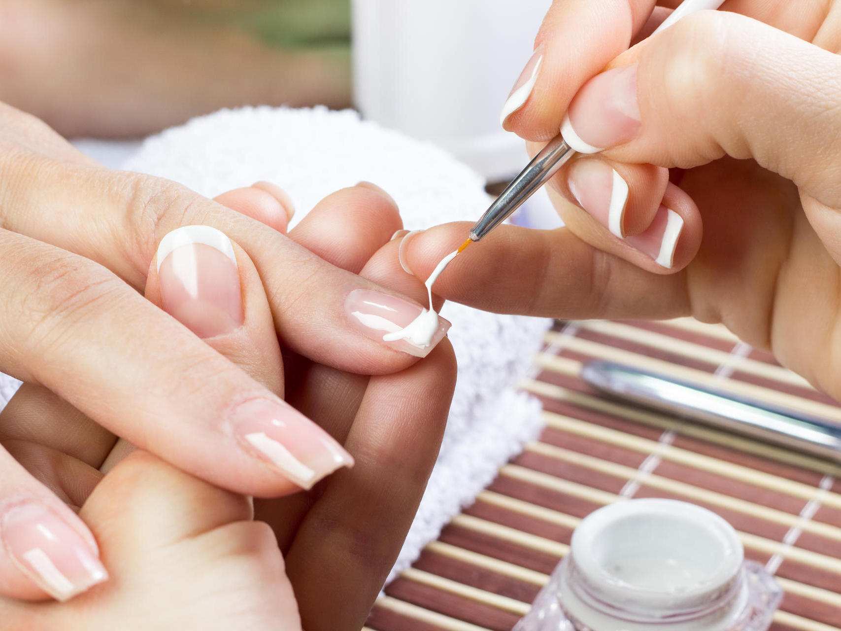 Die weiße beschichtung ist ein spezielles gerät angewendet drei tropfen von farbigem nagellack.