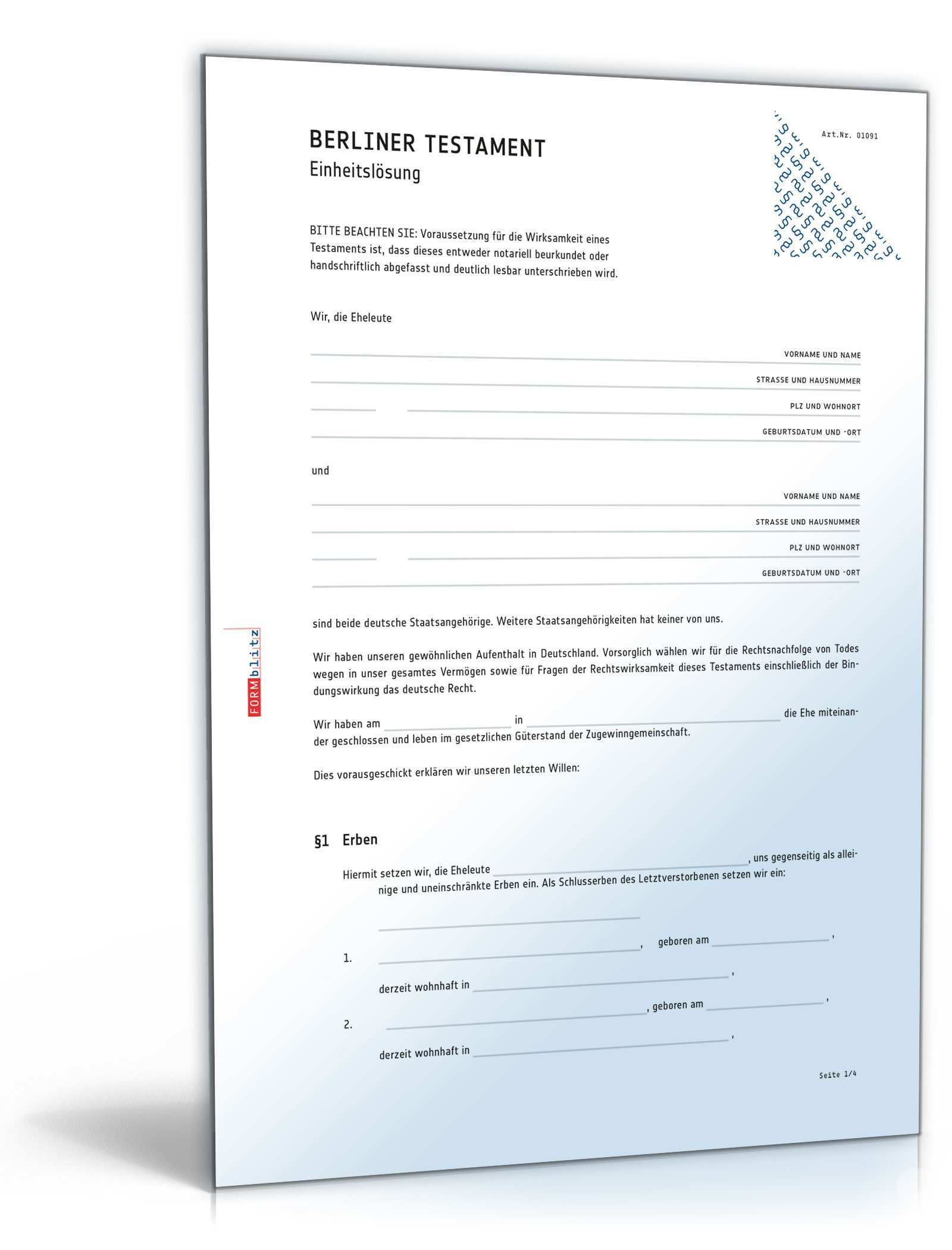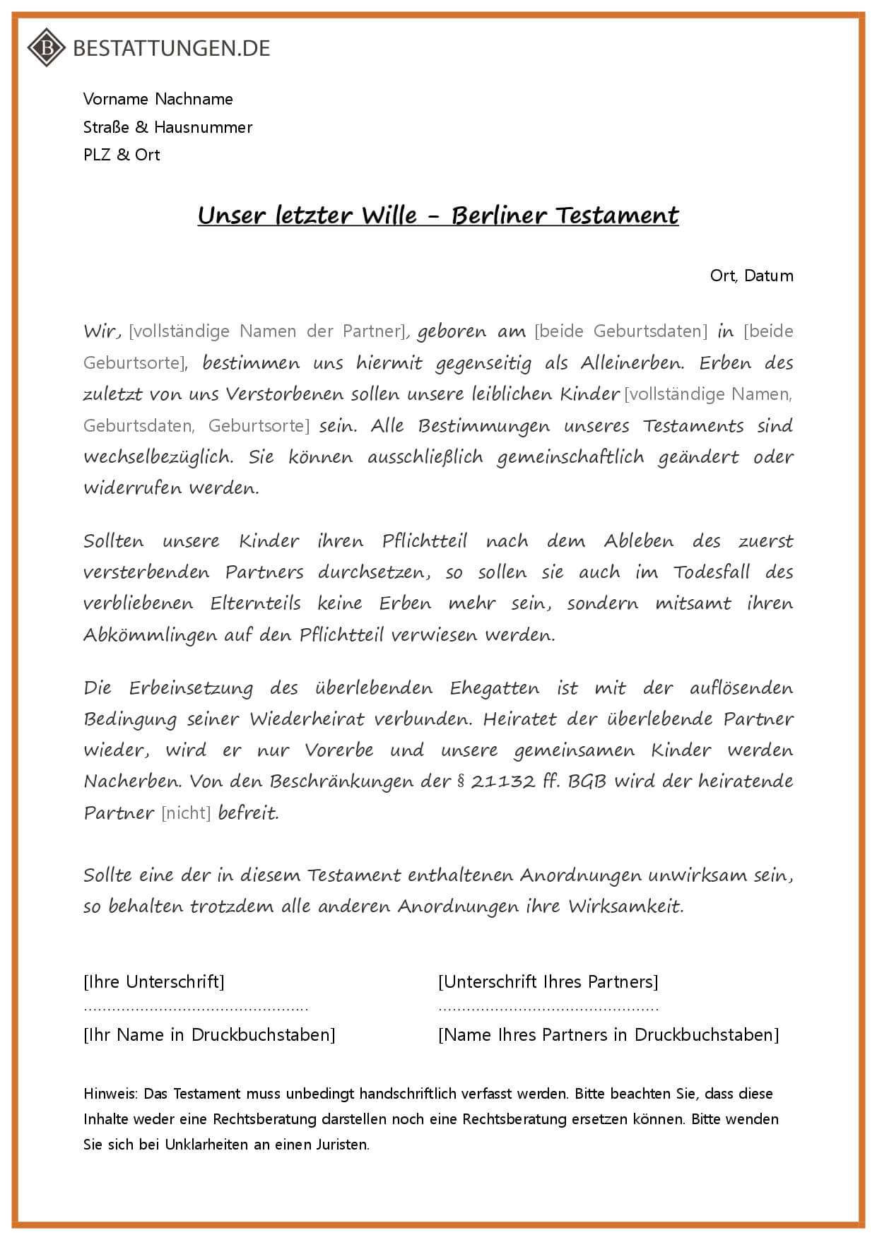 Zu meinem vermögen gehört kein grundbesitz im ausland. Die verschiedenen pflichtteilsstrafklauseln als muster. Das berliner testament ist das am meisten verbreitete testament im deutschsprachigen raum. Wir sind beide deutsche staatsangehörige.