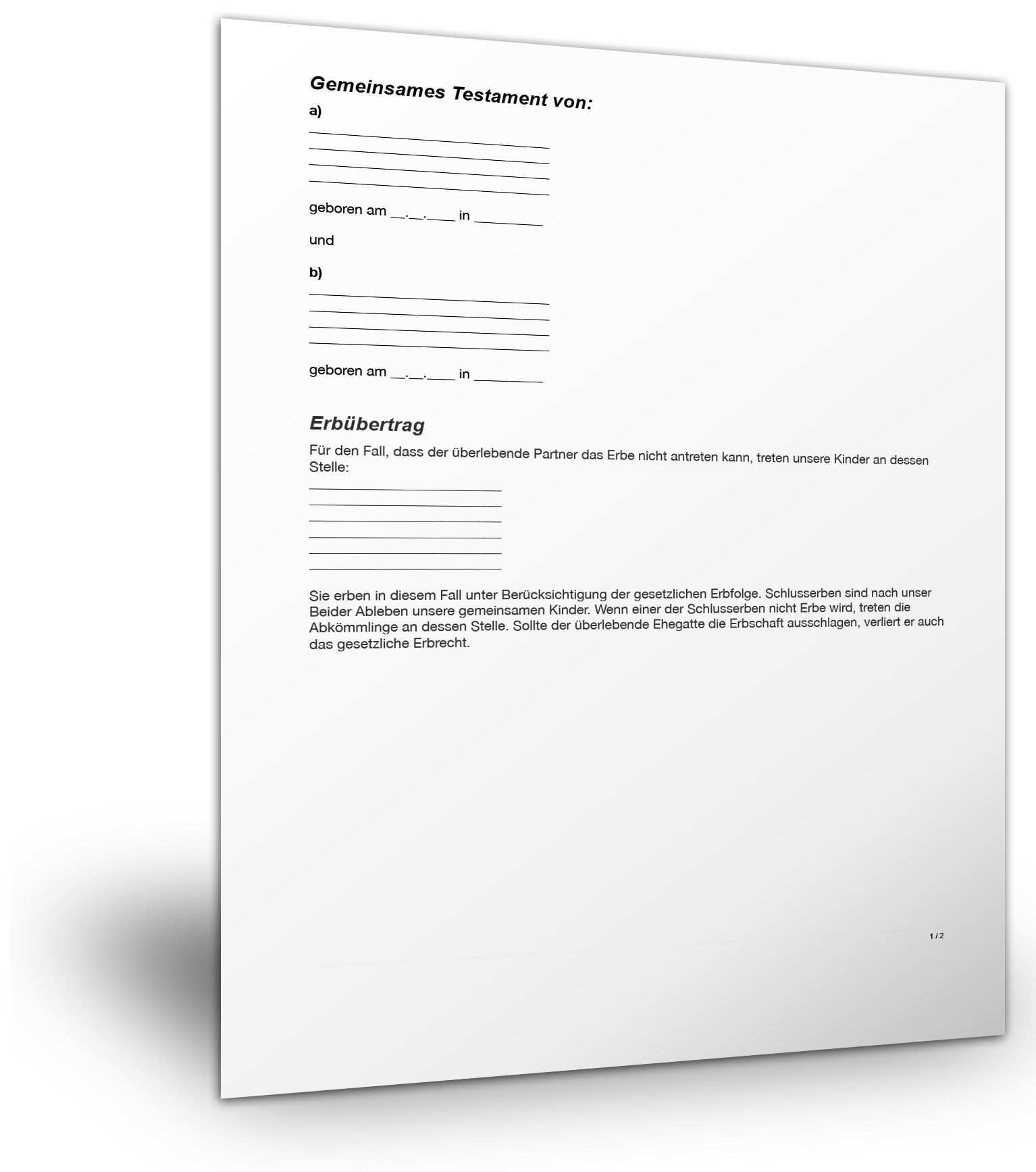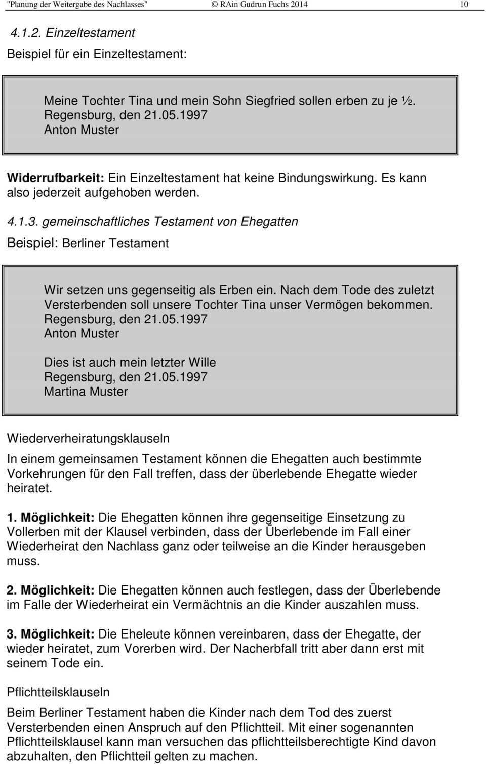 Muster berliner testament mit pflichtteilsklausel. Text der erkennen lässt dass es sich um den letzten willen handelt testament datum seiner errichtung ort an dem das testament geschrieben wurde unterschrift mit vor und zunamen am ende des testaments. Dieser gefahr kann einmal damit begegnet werden dass sie mit ihren kindern bereits zu lebzeiten ein pflichtteilsverzicht vereinbaren. Ich herr muster wurde in geboren. Das hier dargestellte muster eines berliner testaments entspricht der so genannten.