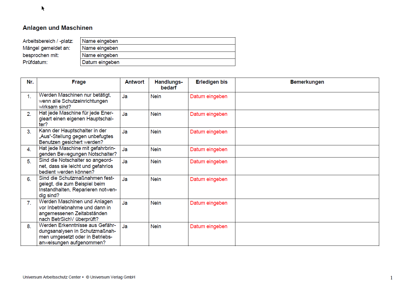 Muster gefaehrdungsbeurteilung instandhaltung an maschinen und anlagen. Zudem können in maschinen ergonomische gefahren lauern wie der handhabung schwerer lasten. Als arbeitsmittel gelten maschinen und anlagen aber auch werkzeuge und geräte die im rahmen der arbeit verwendung finden. Wie wahrscheinlich ist das räumliche und zeitlicher aufeinandertreffen von gefahr und tätigkeit und welche folgen können eintreten. Mit der gefährdungsbeurteilung sollte schon vor der auswahl.