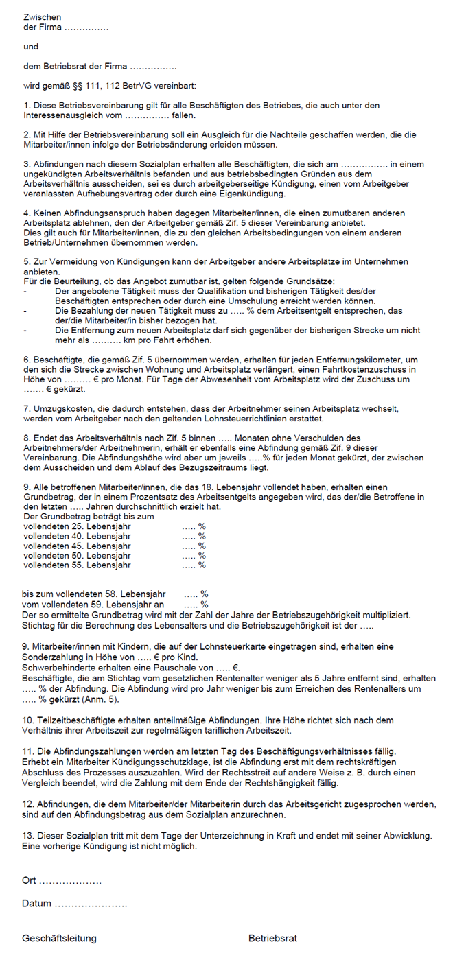 Der interessenausgleich und der sozialplan sollen die negativen folgen mildern und ausgleichen. Beschäftigt ein unternehmen mehr als 20 wahlberechtigte arbeitnehmer ist der arbeitgeber verpflichtet den betriebsrat gemäß 111 betrvg über geplante betriebsänderungen und die dadurch entstehenden nachteile für die belegschaft rechtzeitig und umfassend zu unterrichten. Nicht einfach abschreiben jede vereinbarung muss individuell ausge handelt und auf den jeweiligen betrieb angepasst werden.