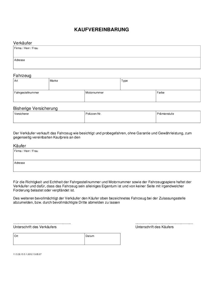 Beide vertragsformulare müssen übereinstimmend ausgefüllt und unterschrieben werden wenn zu einem punkt keine angaben gemacht werden können ist der vermerk unbekannt einzutragen. Dieser kaufvertrag dient der eigentumsübertragung als nachweis für eine versicherung und zulassung sowie der regelung der damit im zusammenhang stehen den üblichen fragen. Der kaufvertrag sollte darüber hinaus eine gewährleistung enthalten dass alle teile des kaufobjekts auch längerfristig funktionieren. Kaufvertrag mit hoher rechtssicherheit so gehen sie kein risiko ein je nach kaufgegenstand und preis kann es durchaus sinn ergeben keinerlei risiko einzugehen.