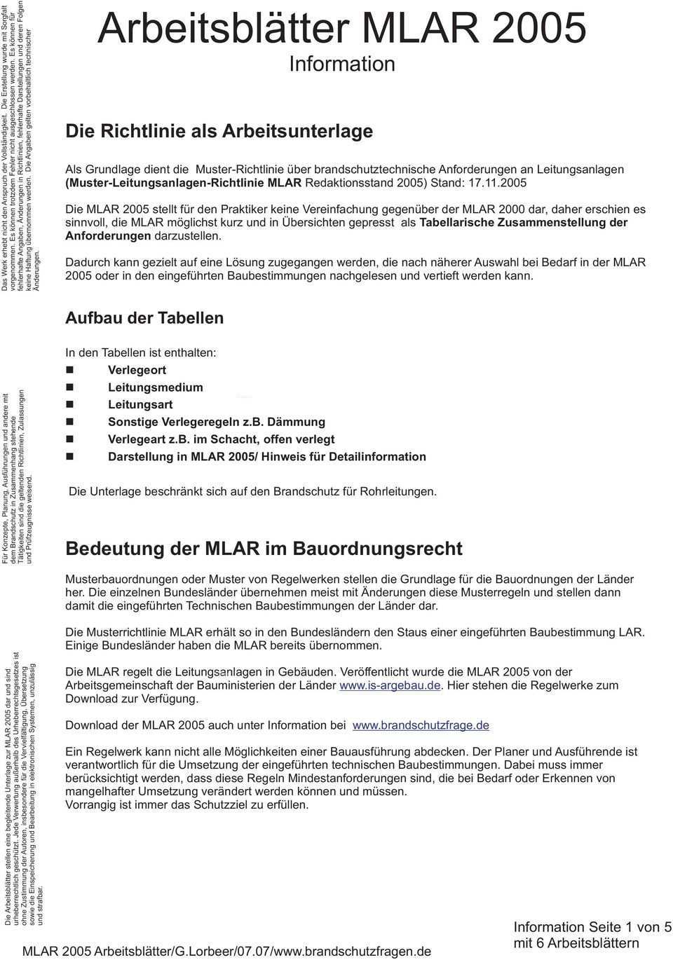Muster leitungsanlagen richtlinie mlar. Was sagen die amazon de nutzerbewertungen. Mlar 2005 kapitel 4 4 3 erleichterungen für einzelne. 46 4 1 2 die leitungen müssen durch abschottungen geführt werden die mindestens die gleiche. Die muster leitungsanlagen richtlinie mlar wurde erstmals 2005 von der arbeitsgemeinschaft der bauministerien der länder veröffentlicht.