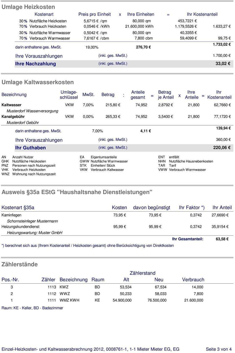 Nebenkostenabrechnung Einliegerwohnung Muster