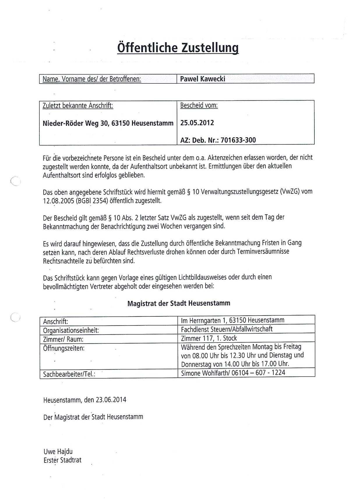 Oeffentliche zustellung muster. öffentliche zustellung bescheid muster. Sollte in dieser zeit also kein einspruch erfolgen setzt die vollstreckung ein. Eine öffentliche zustellung ist mit einer postalischen zusendung gleichzusetzen das bedeutet dass der bußgeldbescheid auch hier nach zwei wochen rechtskräftig wird. In mk 08 122 haben wir über die vorteile einer öffentlichen zustellung berichtet.