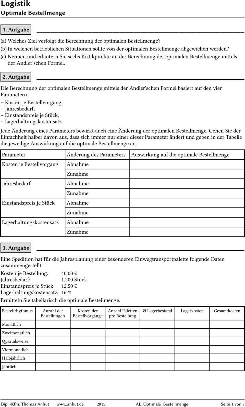 Die optimale losgröße bezeichnet die menge an produkten die gesammelt produziert werden um die produktionskosten z b. Microsoft word optimale losgroesse lagerabbauproblem doc author. Anschließend werden die maschinen 30 minuten lang umgerüstet so dass nunmehr in der zeit von z b. Die reifen ag benötigte im letzten jahr 20 000 autoreifen für die bestellung und den transport der schweren und empfindlichen reifen entstehen der reifen ag pro bestellvorgang kosten in höhe von 3 000 die lagerung der speziellen reifen ist ziemlich aufwendig da eine gewisse raumtemperatur und luftfeuchtigkeit gewährleistet werden müssen um die form der reifen.