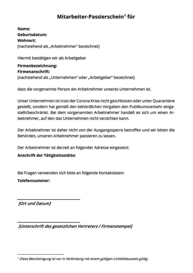Passierschein ausgangssperre vorlage. Zur vorlage gegenüber vollzugsorganen im fall einer ausgangssperre. Jlang jlang created date. Damit frau herr im fall einer ausgangssperre aufgrund der corona pandemie gegenüber den behörden und ordnungskräften die notwendigkeit der fahrten vom wohnort zur arbeitsstätte und zurück nach weisen kann. Die beiden beigefügten muster sind vorschläge unsererseits wie mit diesem thema umgegangen werden kann.