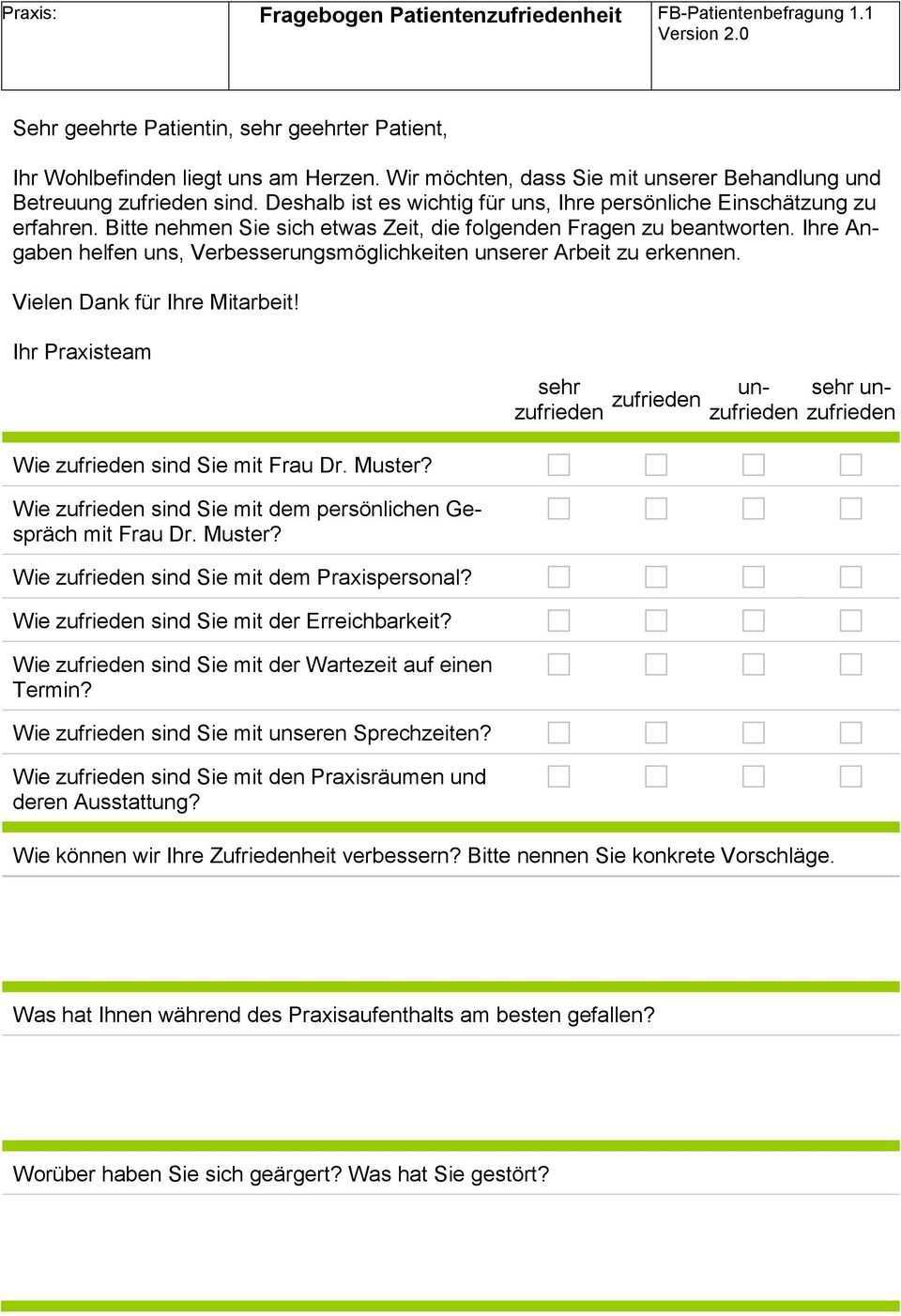Fokusgruppen gruppendiskussionen mit patientinnen und patienten durchgeführt in denen qualitätsrelevante themen und wichtige merkmale und ereignisse einer behandlung eruiert. Zur verbesserung der patientenzufriedenheit und um ein mögliches verbesserungspotential in der arztpraxis zu erkennen können regelmäßig anonyme patientenbefragungen im rahmen des qualitätsmanagement mittel diesem muster fragebogen durchgeführt werden. Patientenbefragung am universitätsklinikum tübingen. Die messung der patientenzufriedenheit in der zahnarztpraxis ist vor allem deshalb sinnvoll weil sie durch die ermittlung ein gutes abbild der stärken und schwachstellen haben.