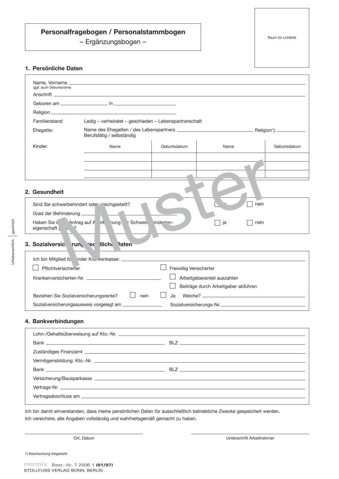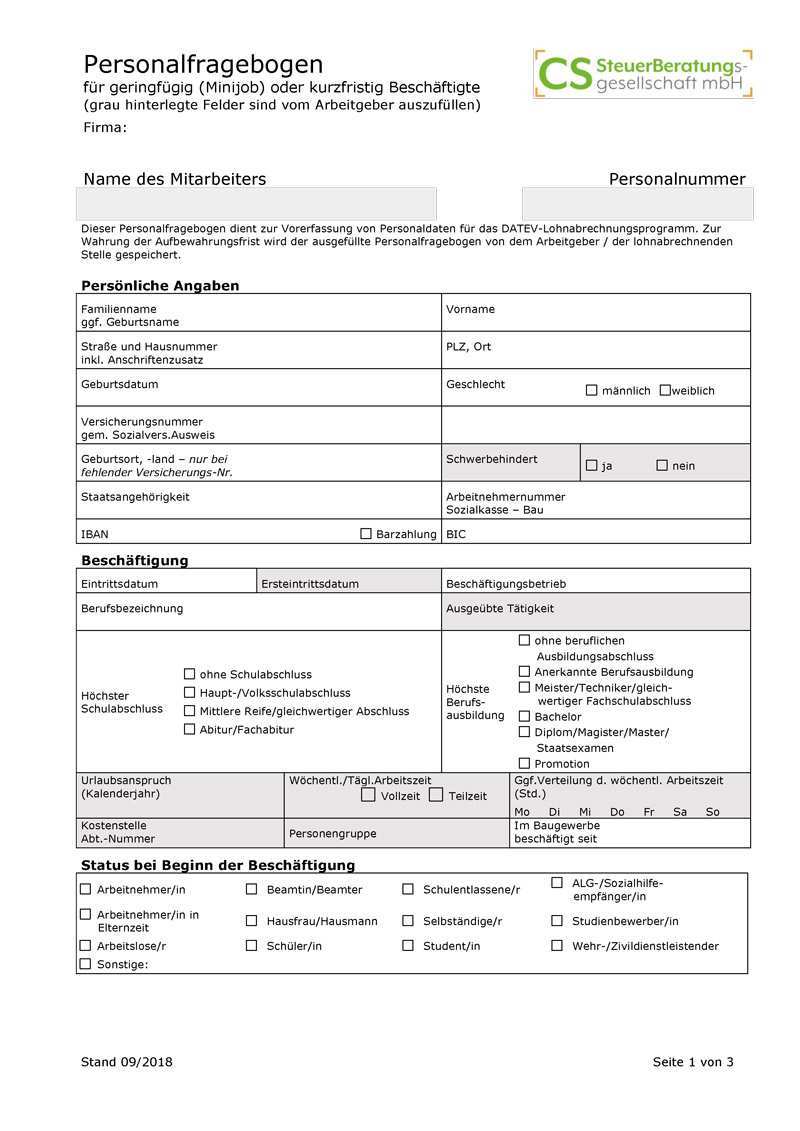 Anschriftenzusatz plz ort geburtsdatum geschlecht männlich weiblich versicherungsnummer gem. Personalfragebogen dieser personalfragebogen dient zur vorerfassung von personaldaten für das datev lohnabrechnungsprogramm. Zur wahrung der aufbewahrungsfrist wird der ausgefüllte personalfragebogen von dem arbeitgeber der lohnabrechnenden stelle gespeichert.