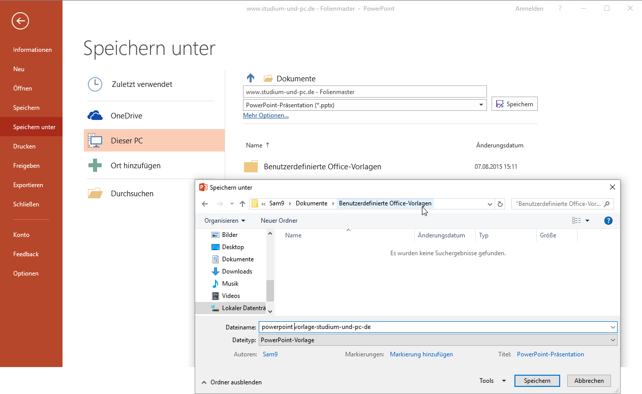 Klicken sie unter speichern auf durchsuchen um das dialogfeld speichern unter zu öffnen. Speichern sie ihr meisterwerk und verwenden sie es für eine präsentation. Wenn sie mit dem aussehen aller ihrer layouts zufrieden sind können sie das template speichern indem sie auf datei und dann auf speichern unter klicken. Den speicherort belassen sie so wie powerpoint es vorschlägt.