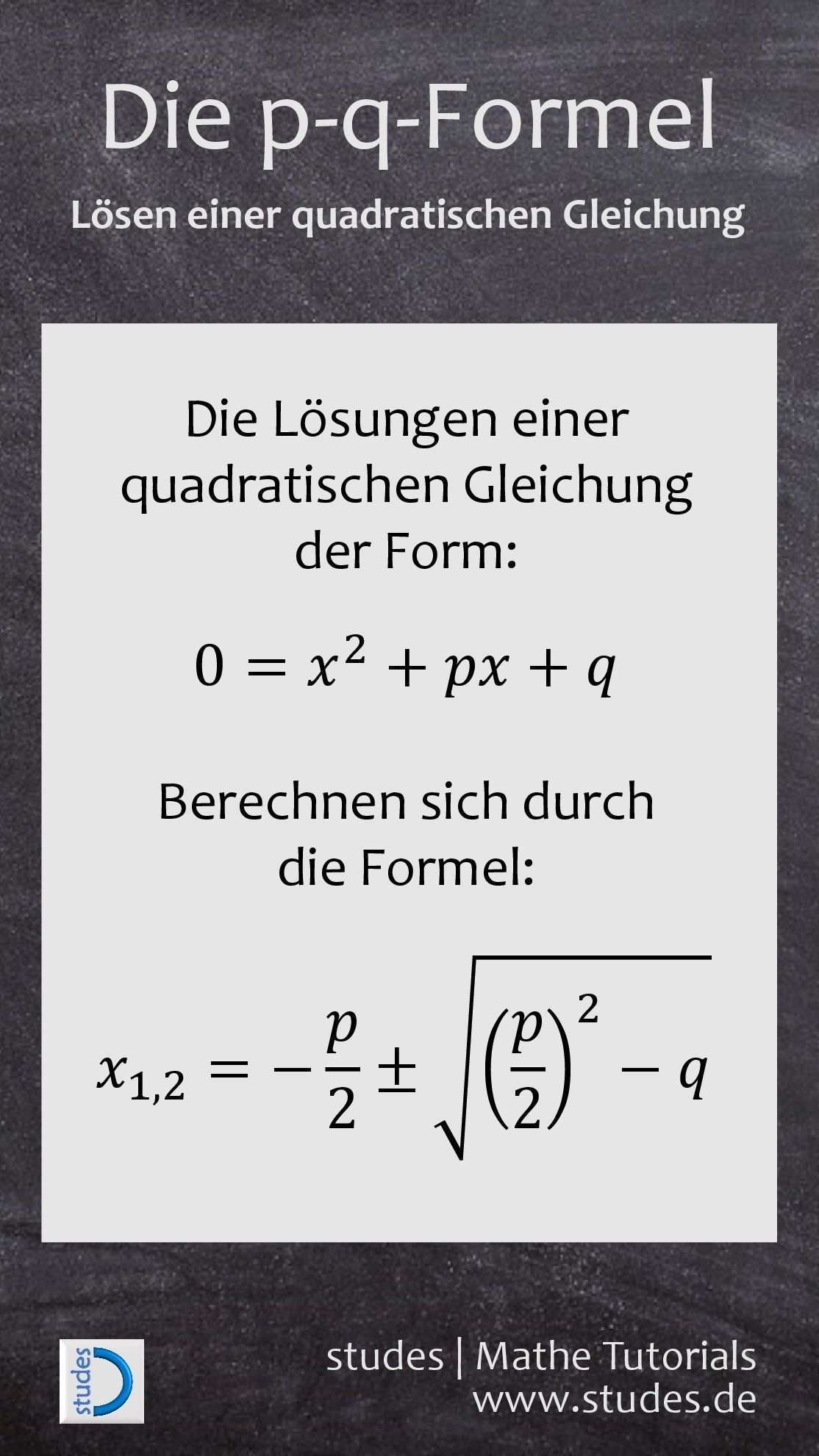 Eine quadratische gleichung in der normalform 0 x 2 px q lässt sich sehr einfach und schnell mit der pq formel x 1 2 frac p 2 pm sqrt 2 frac p 2 2 q lösen hier kannst du kostenlos eine excel tabelle downloaden welche beliebige quadratische gleichung in die oben beschriebene normalform umwandelt. Die gleichung muss zunächst so umgeformt werden dass sie in der normalform da steht danach kann die pq formel angewandt werden. Die pq formel ist eine der wichtigsten formeln um quadratische gleichungen zu lösen wie zum beispiel. Alternativ kannst du auch beide seiten durch zwei teilen und mittels pq formel.